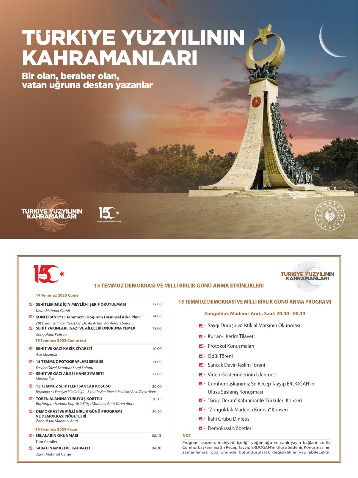 Yerel Yayınlanma: 13 Temmuz 2023 - 17:16 '15 Temmuz Demokrasi ve Milli Birlik Günü' programı belli oldu ‘15 Temmuz Demokrasi ve Milli Birlik Günü’ programı belli oldu Yerel 13 Temmuz 2023 - 17:16 Yorumlar Yazdır A Büyüt A Küçült Yorumlar 15 Temmuz hain darbe girişiminin 7'nci yıldönümü "15 Temmuz demokrasi ve Milli Birlik Günü" programı belli oldu. # 15 temmuz# demokrasi# milli birlik günü# program# belli oldu EDİTÖR Özgür Halkın Sesi YORUMLAR adlı kullanıcıya cevap x Gönder İlginizi Çekebilir GAR KATLİAMI ANILACAK TIP FAKÜLTESİ YOLUNA TADİLAT "Bir an evvel kış lastiği taktırın" ZAMLARDAN BELİ BÜKÜLENLER LİMAN ARKASINI TERCİH ETTİ Son Haberler GAZETECİ HİKMET SÖNMEZ’İ KAYBETTİK İzinsiz uçurulan dronlar düşürülecek Kafkametler batmasıyla ilgili 3 sanık yargılanıyor Soba külü yangına neden oldu Ereğlili köylülerden OSB protestosu: ‘Toprağımızı, geleceğimizi... Haftaya çarşambaya ekmek 7,5 lira Haftaya çarşambaya ekmek 7,5 lira