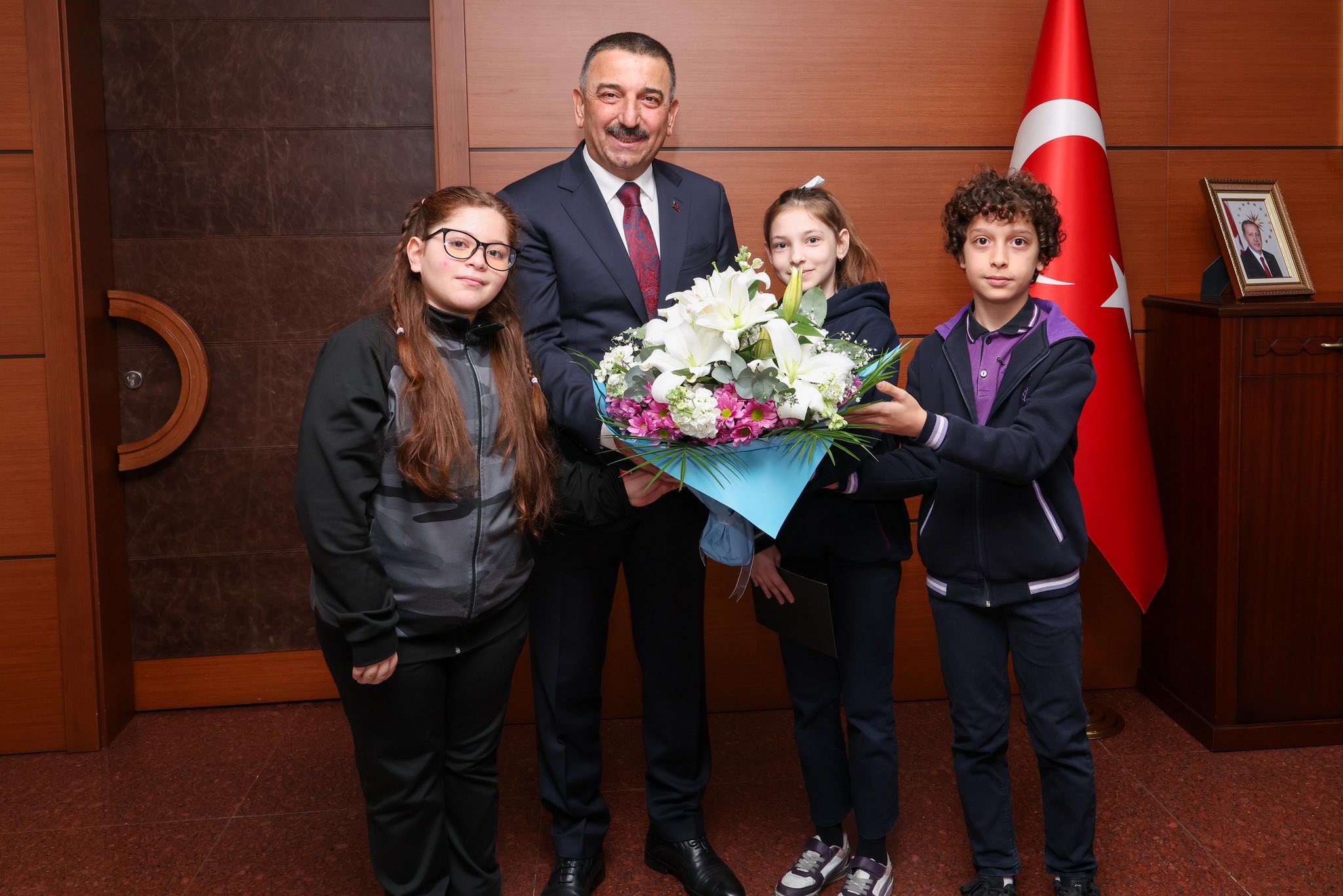 İl Milli Eğitim Müdürü Uygar Keskin ile birlikte İbrahim Fikri Anıl Ortaokulu öğrencileri Gülsüm Öztürk, Miraç Karaahmetoğlu ve Zeynep Nisa Fidan, öğretmenleri Filiz Altun Keleş ve Okul Müdürü Yakup Balçın eşliğinde Valilik makamını ziyaret etti.
