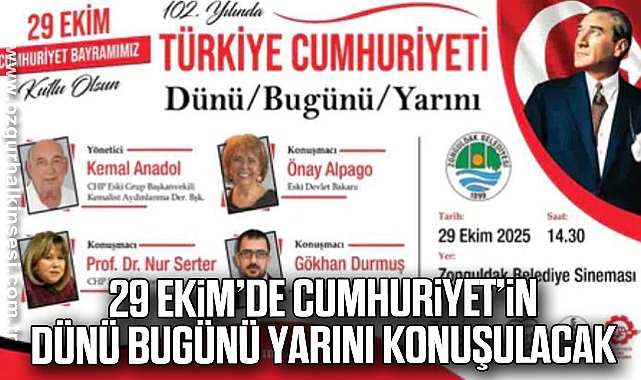 “Türkiye Cumhuriyeti: Dünü / Bugünü / Yarını” başlıklı etkinlik, 29 Ekim 2025 Çarşamba günü saat 14.30’da Zonguldak Belediye Sineması’nda gerçekleştirilecek.Zonguldak Belediyesi ve Çağdaş Gazeteciler Derneği iş birliğiyle düzenlenen