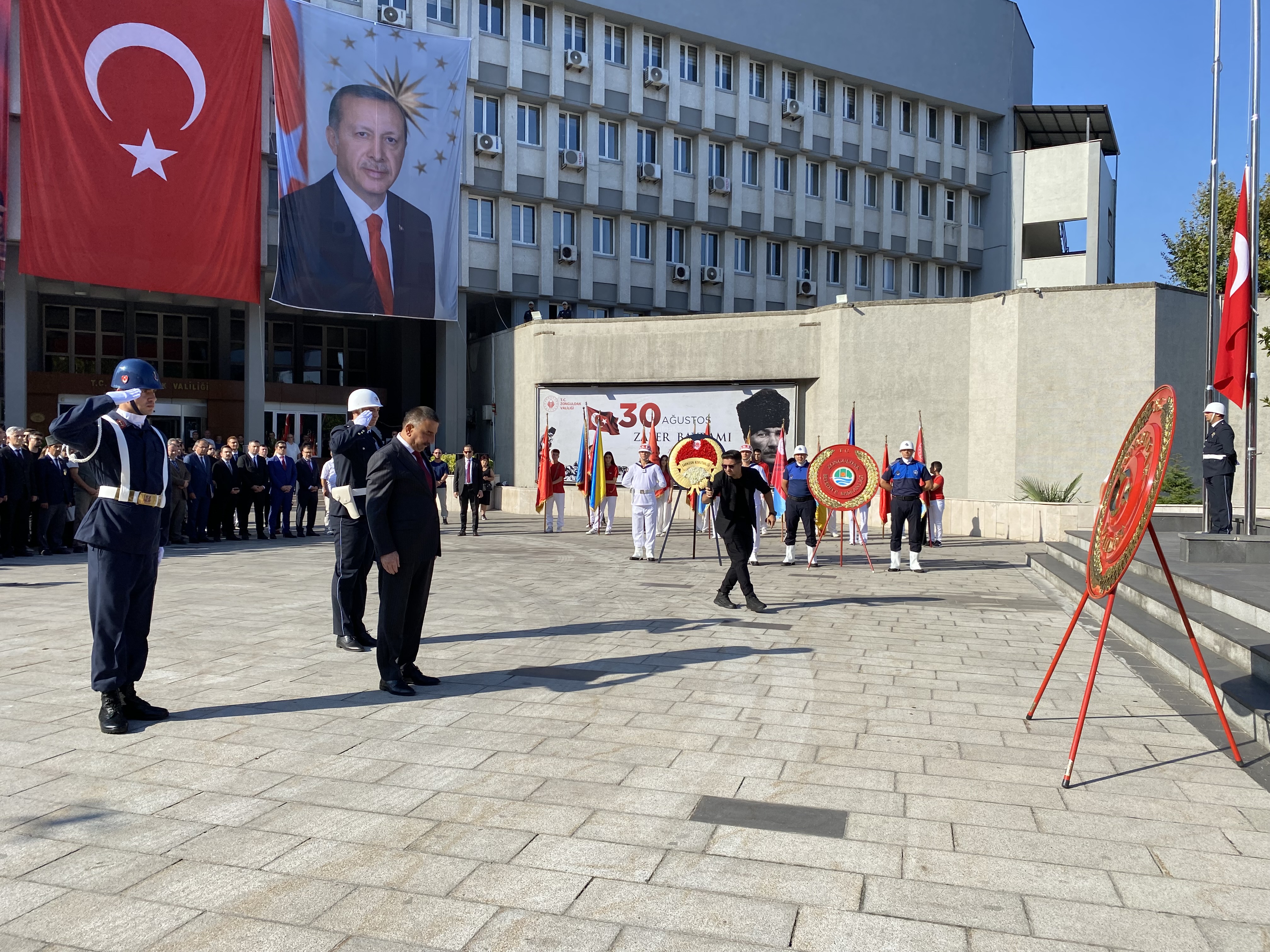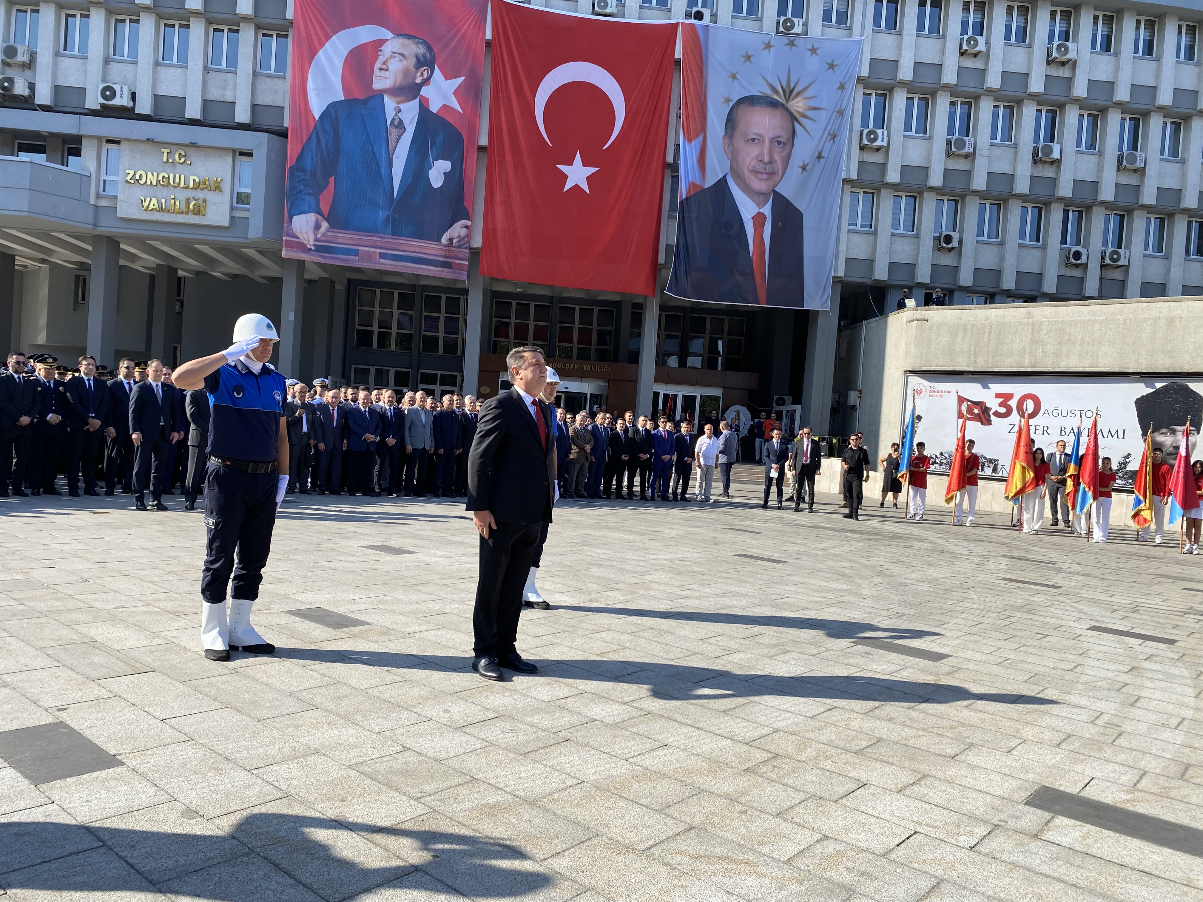 Haber: Merve HASANOĞLU - Cevat Baran ÇAYDAŞ Valiliğin önündeki Atatürk Anıtı önünde düzenlenen törene Zonguldak Valisi Osman Hacıbektaşoğlu, Vali Yardımcıları, CHP Zonguldak Milletvekili Deniz Yavuzyılmaz, Zonguldak Belediye Başkanı Tahsin Erdem, İl Genel Meclisi Başkanı Necdet Karaveli, siyasi parti ile sivil toplum kuruluşu temsilcileri, daire müdürleri, kolluk kuvveti amirleri ve çok sayıda vatandaş katıldı.Saygı duruşu ve İstiklal Marşı okunmasıyla başlayan tören, Atatürk Anıtı’na çelenk konulmasıyla devam etti. Ardından Zonguldak Valiliği'nde tebrik töreni gerçekleştirildi. Zafer Bayramı resmî kutlama programı geçit töreniyle devam edecek.