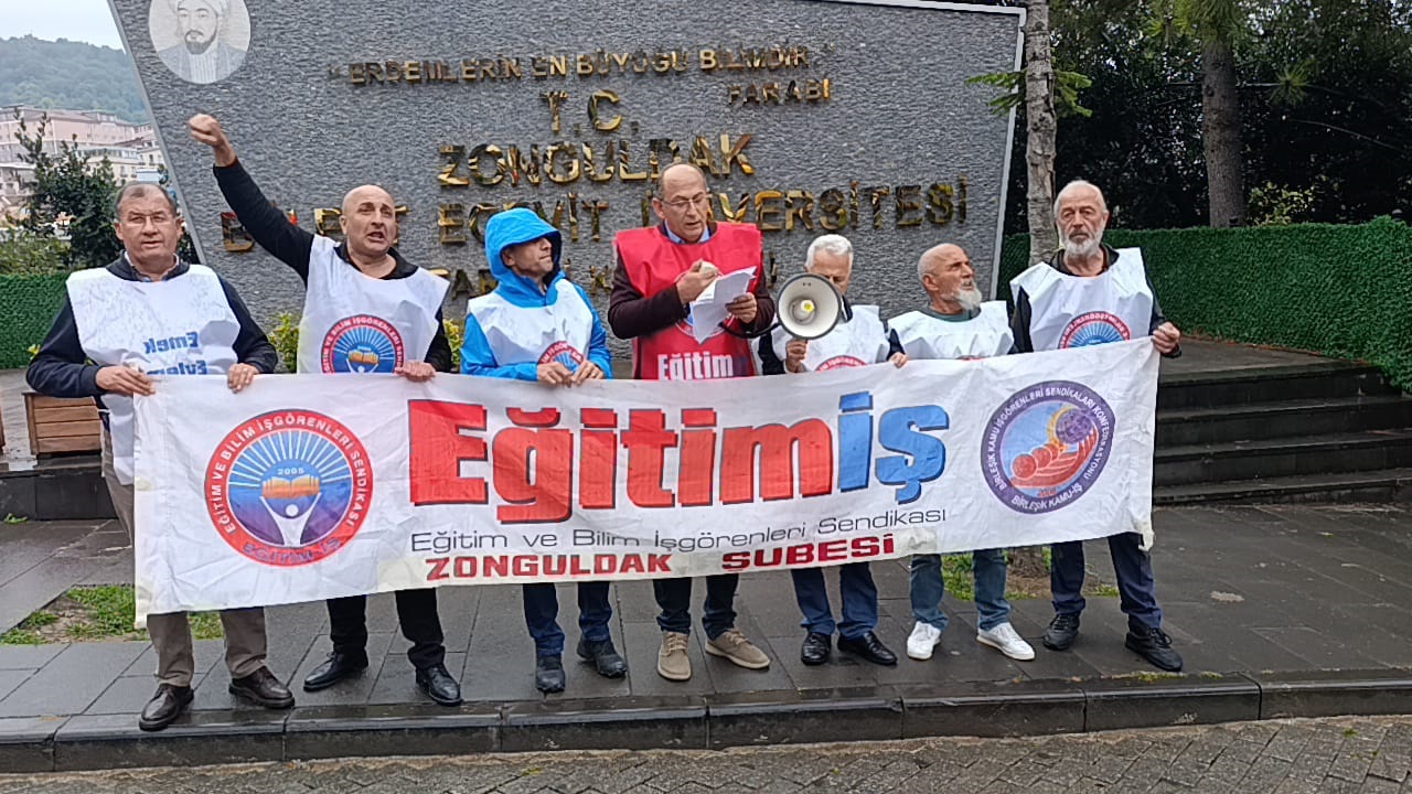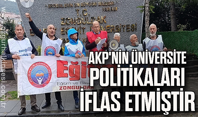 Haber: Şebnem SAKA Eğitim-İş pankartı altında toplanarak sendika yeleklerini giyen Eğitim-İş üyeleri, iktidarın üniversite eğitimi politikalarına basın açıklamasıyla tepki gösterdi. Basın açıklamasını yapan Eğitim-İş Zonguldak Şube Başkanı Kamuran Çataklı, üniversitelerin Cumhuriyet tarihinin en ağır kuşatması altında olduğunu belirterek, AKP iktidarının akademik özgürlüğü, bilimsel liyakati ve düşünce özgürlüğünü gasp ettiğini öne sürdü.Çataklı, şunları kaydetti:Bugün üniversitelerimiz, Cumhuriyet tarihinin en ağır kuşatması altındadır. AKP iktidarı; yükseköğretimi, akademik özgürlüğü, bilimsel liyakati, düşünce özgürlüğünü ve gençliğin geleceğini gasp etmektedir.