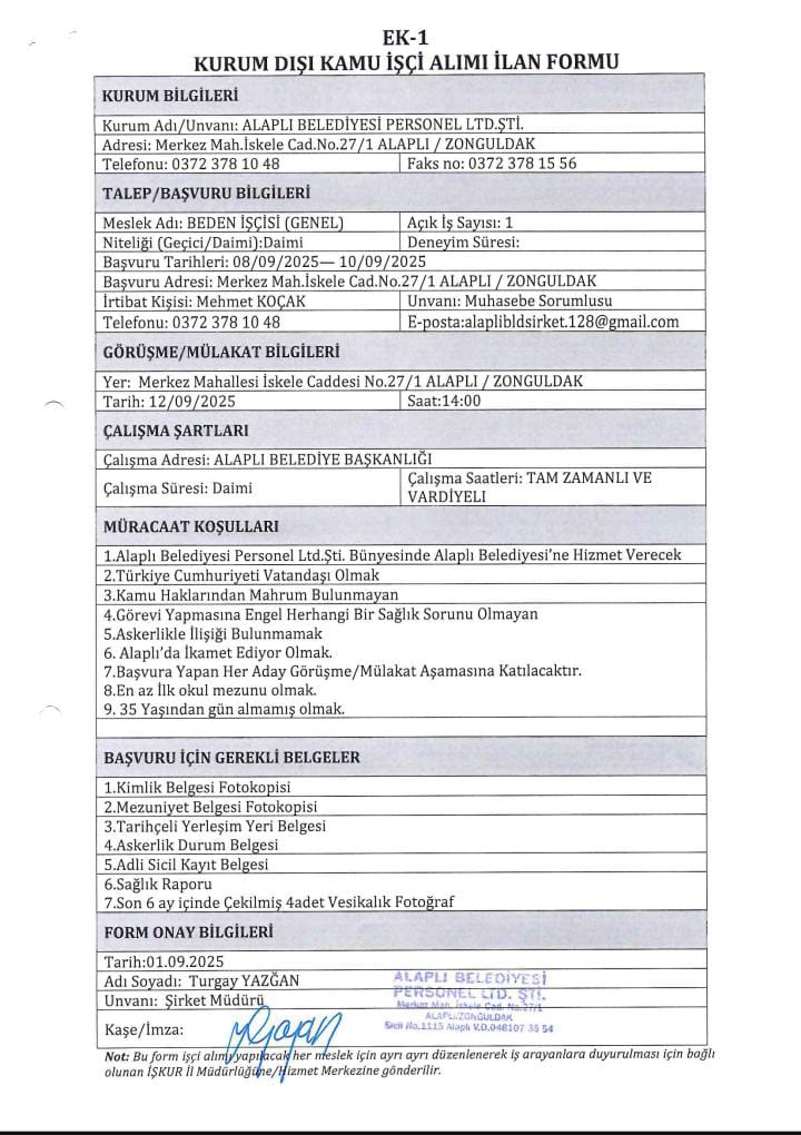 Başvuru yapacak adayların belirli şartları taşıması gerekiyor. Bu şartlar arasında T.C. vatandaşı olmak, kamu haklarından mahrum olmamak, görevi yapmasına engel bir sağlık sorununun bulunmaması ve askerlikle ilişiğinin olmaması yer alıyor.Adayların ayrıca Alaplı'da ikamet ediyor olması ve en az ilkokul mezunu olması şartı aranıyor.İşte başvuru detayları: