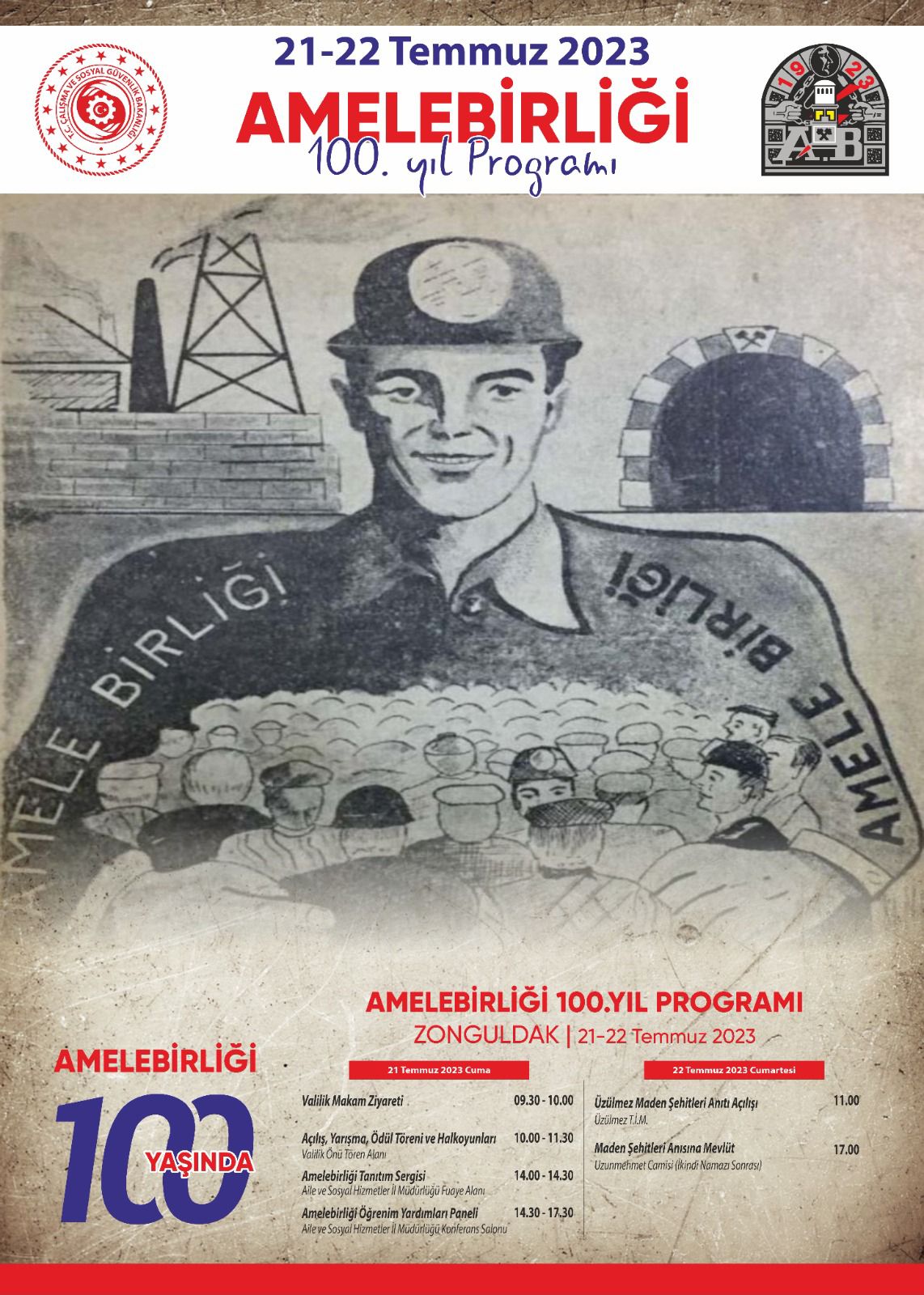 22 Temmuz 1923 tarihinde “AMELEBİRLİĞİ TALİMATNAMESİ” çıkarmasıyla “ÜLKENİN İLK SOSYAL GÜVENLİK YASASI” uygulamasına başlanmıştır. Cumhuriyetin anıt kurumlarından Amelebirliği, 21- 22 Temmuz 2023 tarihleri arasında 100. yılını bu nedenle kutluyor.Kutlamalar, Valilik önü Tören Alanında, 21. 7. 2023, Cuma günü Saat: 10.00 ‘da yapılacak açılış ile başlayacak.Zonguldak İl Milli Eğitim Müdürlüğü tarafından düzenlenen AMELEBİRLİĞİNİN 100. YILI ŞİİR-KOMPOZİSYON ve RESİM YARIŞMALARINDA DERECEYE GİREN ÖĞRENCİLERİN Ödülleri verilecek.