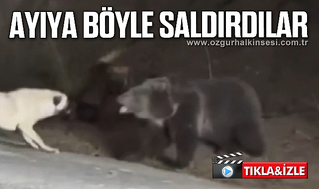 Görüntülerde, köpeklerin ayıya saldırmaya çalıştığı gözüküyor. Vatandaşlar ise ayıyı korna çalarak uzaklaştırmaya çalışıyor.