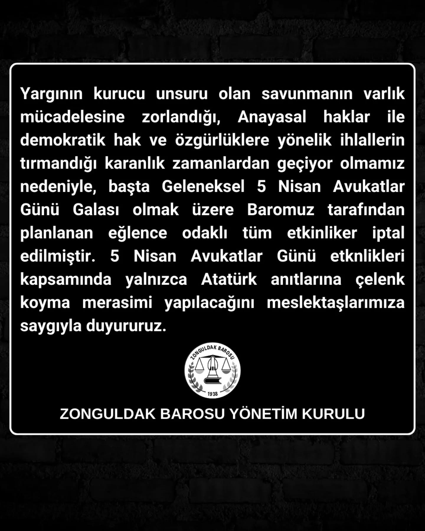 Zonguldak Barosu, İstanbul Büyükşehir Belediye Başkanı Ekrem İmamoğlu ile birlikte Şişli Belediye Başkanı Resul Emrah Şahan ve Beylikdüzü Belediye Başkanı Mehmet Murat Çalık’ın aralarında bulunduğu çok sayıda kişinin "yolsuzluk" soruşturması kapsamında tutuklanmasının ardından 5 Nisan Avukatlar Günü dolayısıyla yapılması planlanan Gala ve eğlence etkinliklerini iptal etme kararı aldıklarını açıkladı. Barodan yapılan açıklama şöyle: