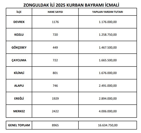 Valiliğin yayımladığı Zonguldak ili Kurban Bayramı icmali şöyle: