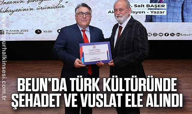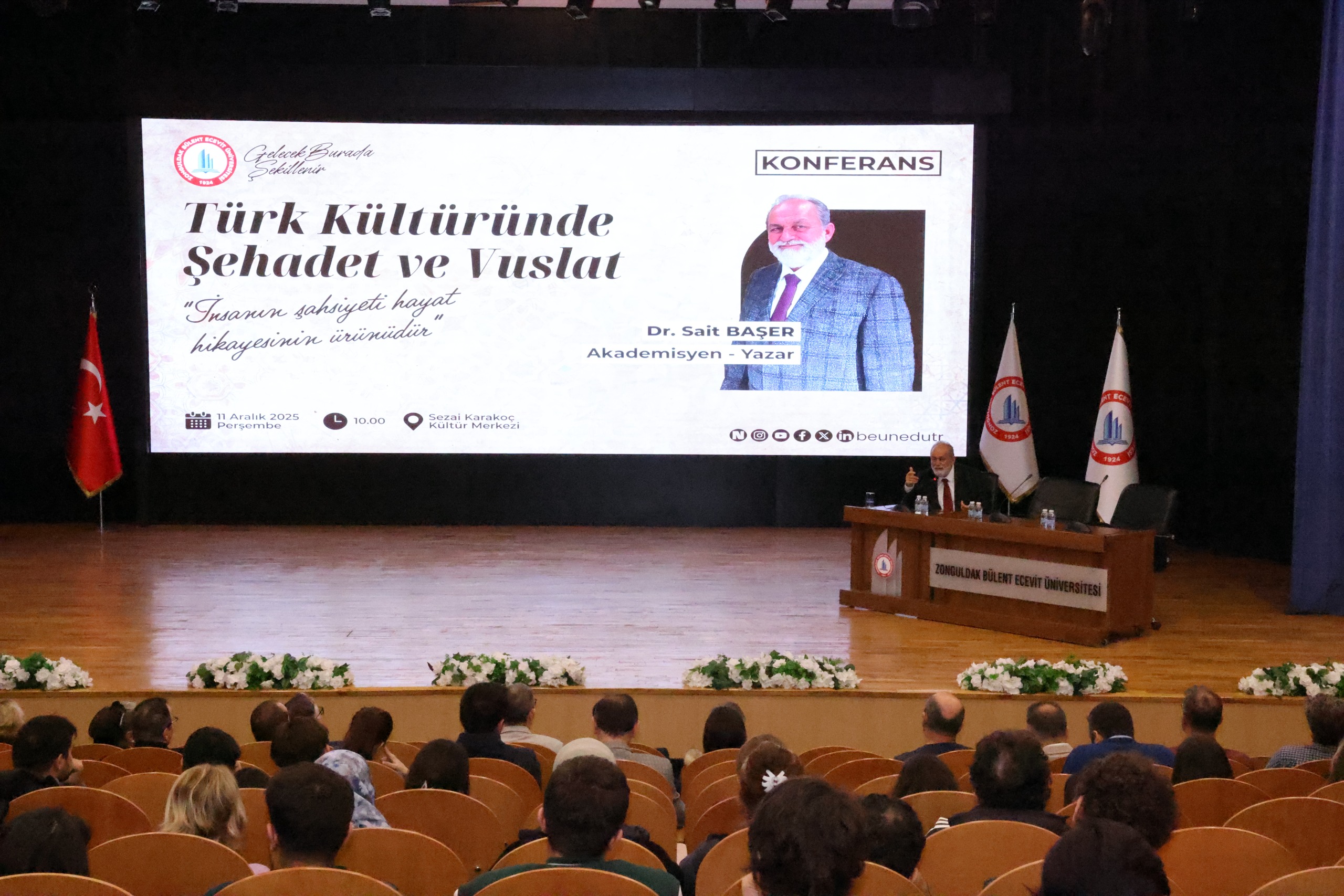 Açılış konuşmasının ardından konferansın konuşmacısı yazar Dr. Sait Başer kürsüye çıktı. Türk Kültürü üzerine derinlikli bir perspektif sunan Başer, Mevlana’dan Dede Korkut’a uzanan köklü geleneğin bugün dahi yol göstericiliğini sürdürdüğünü ifade etti. Başer; “Tanrı kelimesinin çoğulu olmaz, kültürümüz buna müsaade etmez. Kültür; bir milletin yüzyıllar boyunca yoğurduğu tecrübenin adıdır. Türk kültürü köleliği tanımaz; adalet duygusuyla var olmuş bir medeniyetin ürünüdür.” sözleriyle kültür kavramının Türk-İslam düşüncesindeki yerine vurgu yaptı. Adaletin yalnızca hukuk değil, hayatın tamamını kuşatan bir denge ölçüsü olduğunu belirten Başer, Türkçenin köklü yapısının bu kavramla doğrudan ilişkili olduğunu ifade etti. Başer, konuşmasının sonunda Hz. Mevlana'nın özlü sözlerinden örnekler vererek vuslatının 752. yıl dönümü münasebetiyle Mevlana'yı rahmetle anıp sözlerini sonlandırdı.