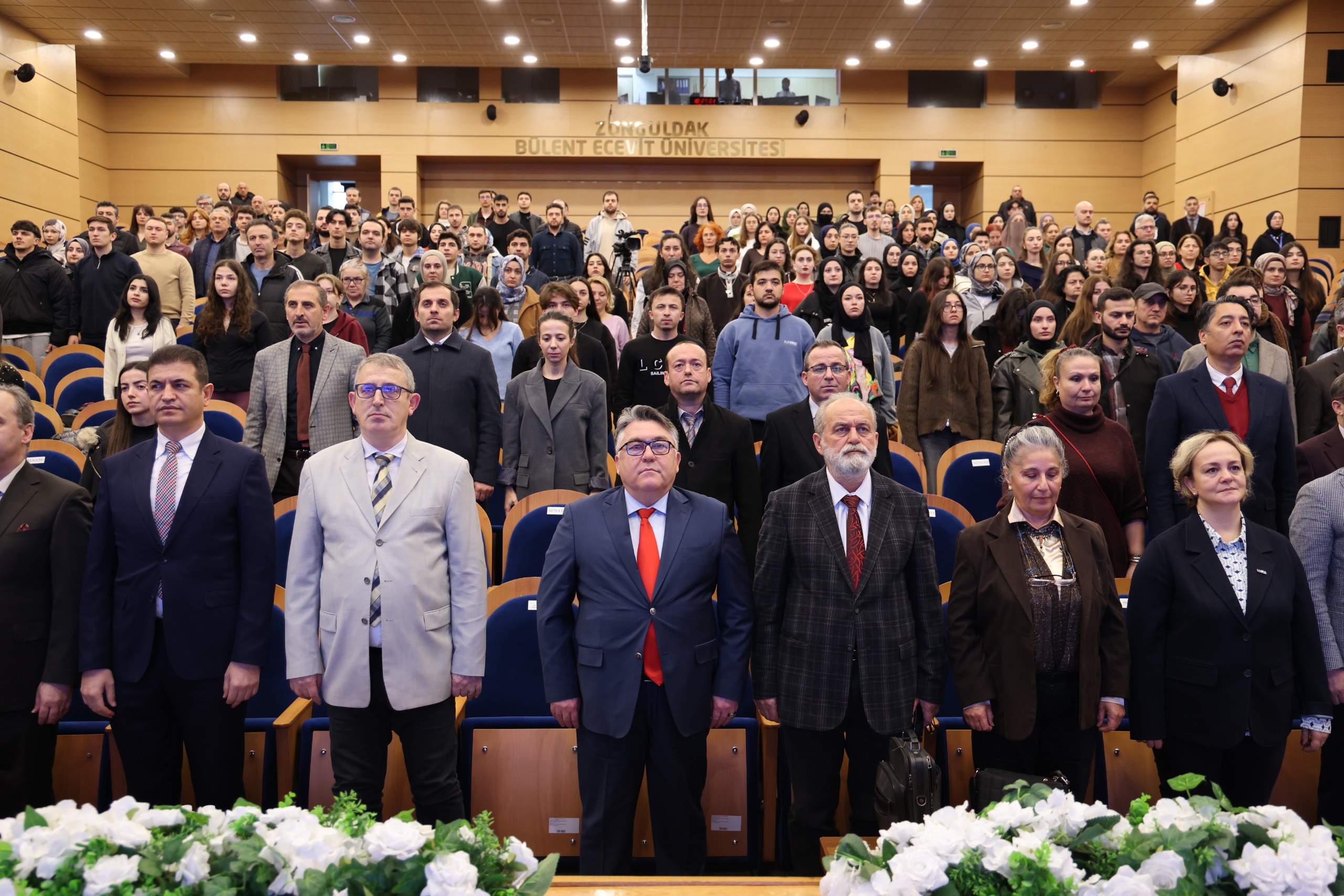 Program, aziz şehitlerin anısına yapılan saygı duruşu ve İstiklal Marşı'nın okunmasıyla başladı. Ardından BEUN Rektörü Prof. Dr. İsmail Hakkı Özölçer açılış konuşmasını yapmak üzere kürsüye geldi. Rektör Özölçer konuşmasında, iki üniversite öğrencisinin vefat ettiğini hatırlatarak üzüntülerini şu sözlerle dile getirdi: