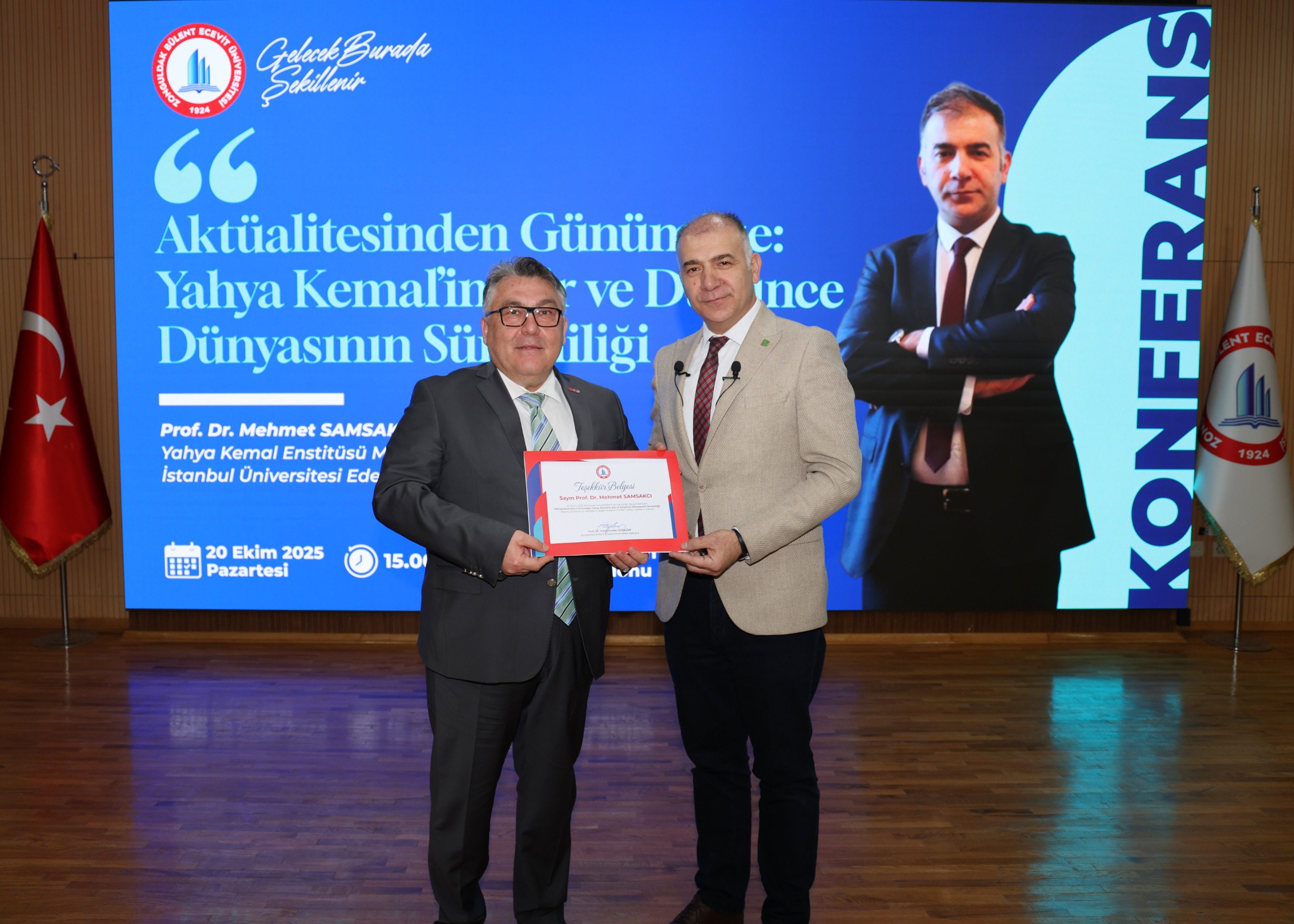 BEUN ev sahipliğinde gerçekleşen “Aktüalitesinden Günümüze: Yahya Kemal'in Şiir ve Düşünce Dünyasının Sürekliliği” başlıklı konferans, Prof. Dr. Mehmet Samsakcı’ya teşekkür belgesinin takdim edilmesiyle ve günün anısına çekilen hatıra fotoğrafıyla son buldu.