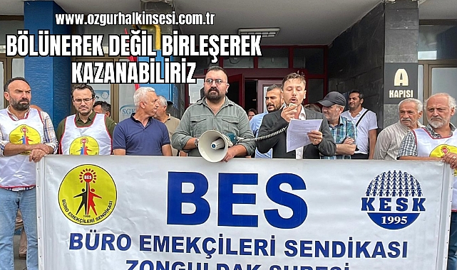 BES Şube Yöneticisi Erkan Katırcıoğlu, toplanan grup adına yaptığı açıklamada, günümüzde gelişen "meslek veya işyeri esasına göre" kurulan sendikaların emekçileri böldüğünü ve taleplerini görünmez hale getirdiğini savundu. 2026 ve 2027 yıllarını kapsayan 8. Dönem Toplu Sözleşme ile yaşanan hak kayıplarının birleşmenin önemini gösterdiğini vurgulayan Katırcıoğlu, şunları söyledi:"Bizler birleşmedikçe her gün daha fazla kayıp etmeye devam etmekteyiz. Bunun en somut örneği 2026 ve 2027 yıllarını kapsayan 8. Dönem toplu sözleşmeyle yaşadığımız derin hak kayıplarıdır. Bunun için işkolumuzda sendikal hareketinin ilk kurucu sendikalarını bünyesinde toplayan sendika ola rak, kamu emekçilerin ekonomik, özlük ve demokratik haklarını grevli toplu sözleşmeli sendikal hak mücadelesi ile kazanabileceklerini mücadele tarihimizden biliyoruz." Katırcıoğlu, sendika olarak hükümetten taleplerini şöyle sıraladı:Anayasa Mahkemesi kararına rağmen halen ödenmeyen ikramiye, ek ödeme ve diğer ekonomik kayıplar geriye dönük ödensin!