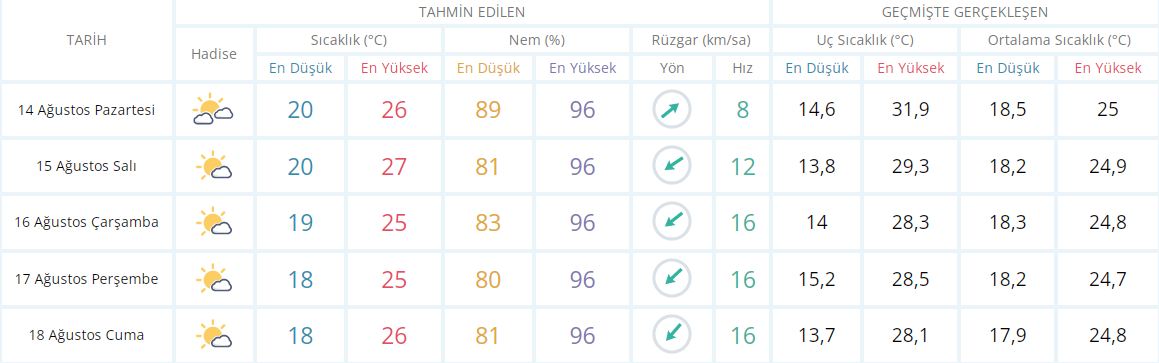 Meteoroloji Genel Müdürlüğü'nden alınan günlük hava raporlarına göre, bu hafta Zonguldak'ta sıcaklığın en düşük 18, en yüksek 27 olması bekleniyor. Nem oranı ise en düşük 80 iken en yüksek %96 olacağı tahmin ediliyor.
