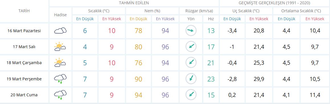 16 Mart Pazartesi günü kentte çok bulutlu bir hava bekleniyor. Hava sıcaklığı en düşük 6, en yüksek 10 derece olacak. Nem oranının yüzde 78 ile 94 arasında değişmesi beklenirken rüzgârın saatte yaklaşık 13 kilometre hızla esmesi tahmin ediliyor.