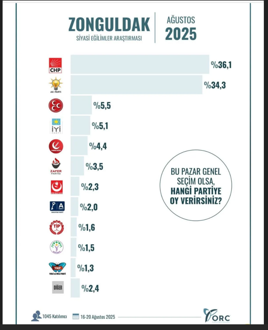 ORC Araştırma Şirketi, 16-20 Ağustos 2025 tarihlerinde Zonguldak'ta gerçekleştirdiği ve bin 45 kişinin katılım sağladığı "Bu pazar seçim olsa hangi partiye oy verirsiniz?" anket sonuçlarını açıkladı.