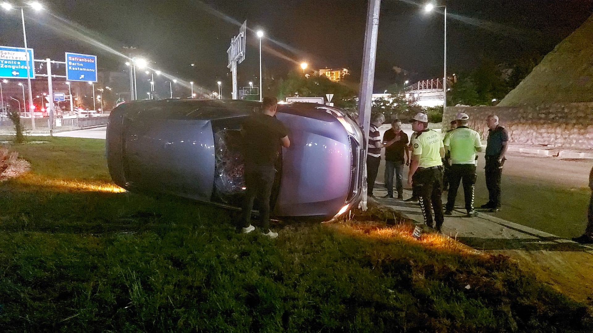 "Dur" ihtarına uymayarak kaçan sürücünün kullandığı otomobil, Öğlebeli Kavşağına geldiği sırada refüje çıkarak devrildi.