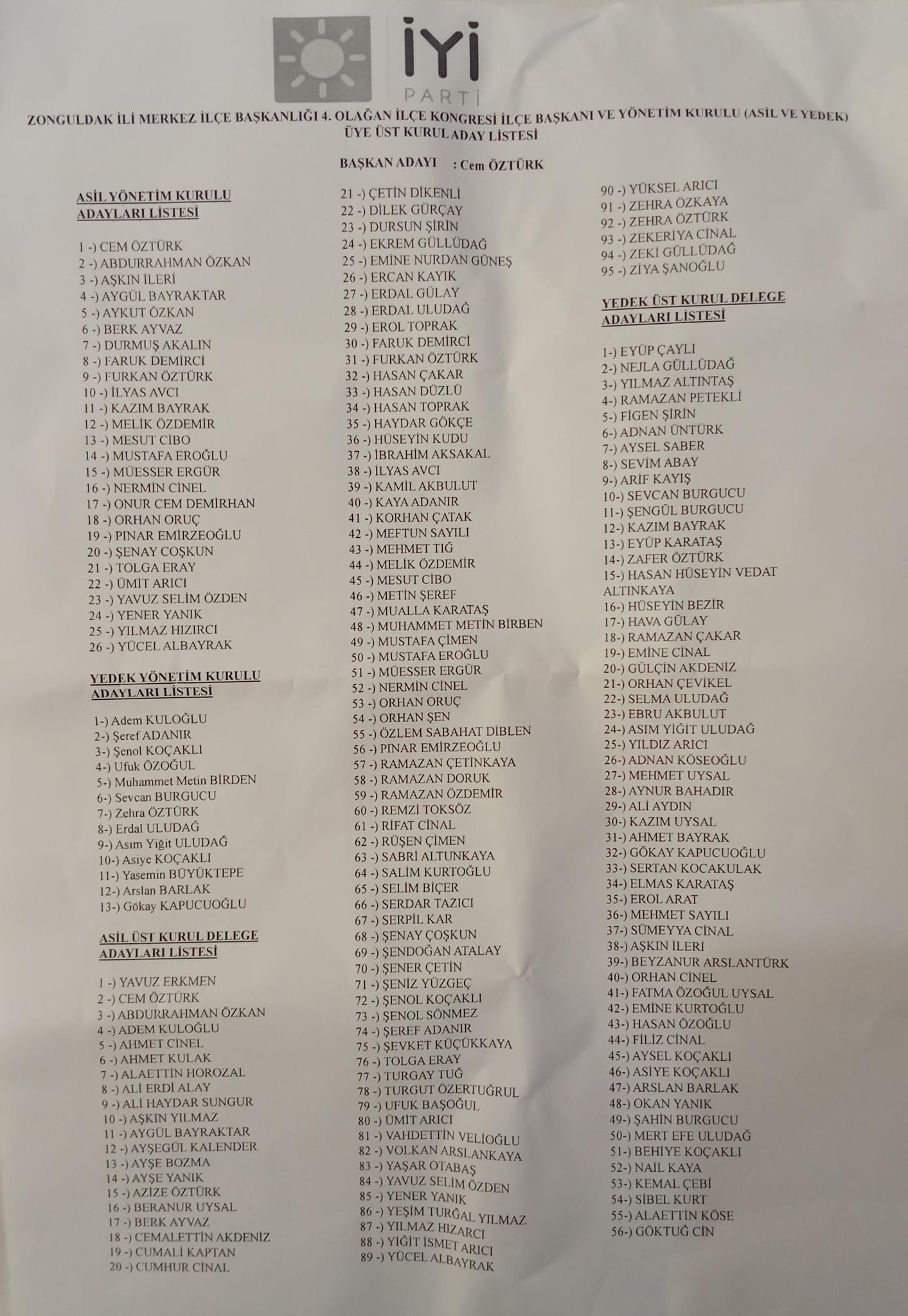 Tek aday ve tek listenin yer aldığı kongrede, Öztürk'ün karşısına başka bir aday çıkmadı. Yapılacak oylamanın ardından Cem Öztürk'ün İYİ Parti Zonguldak Merkez İlçe Başkanlığı görevine devam etmesi bekleniyor.İşte Cem Öztürk'ün listesi: