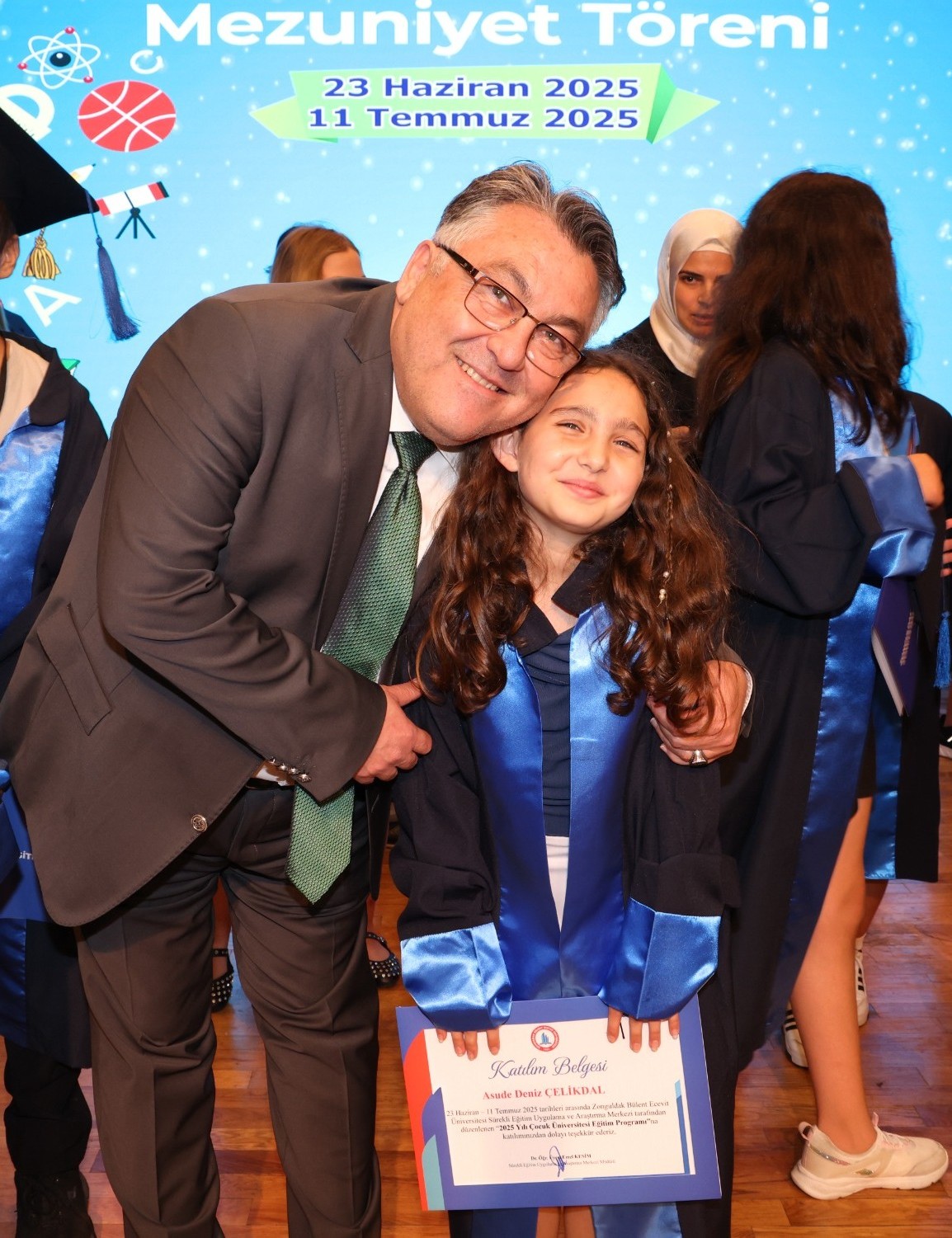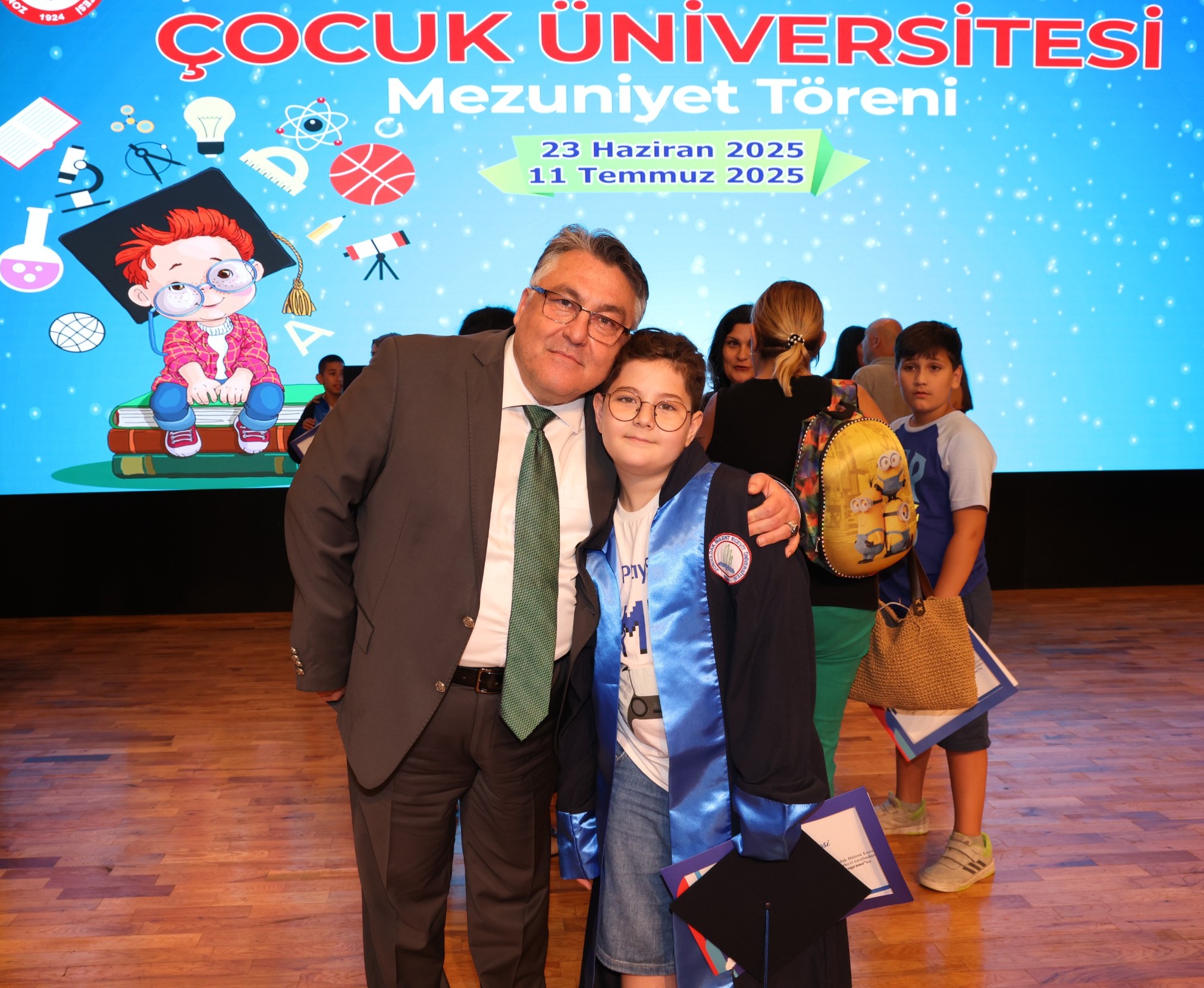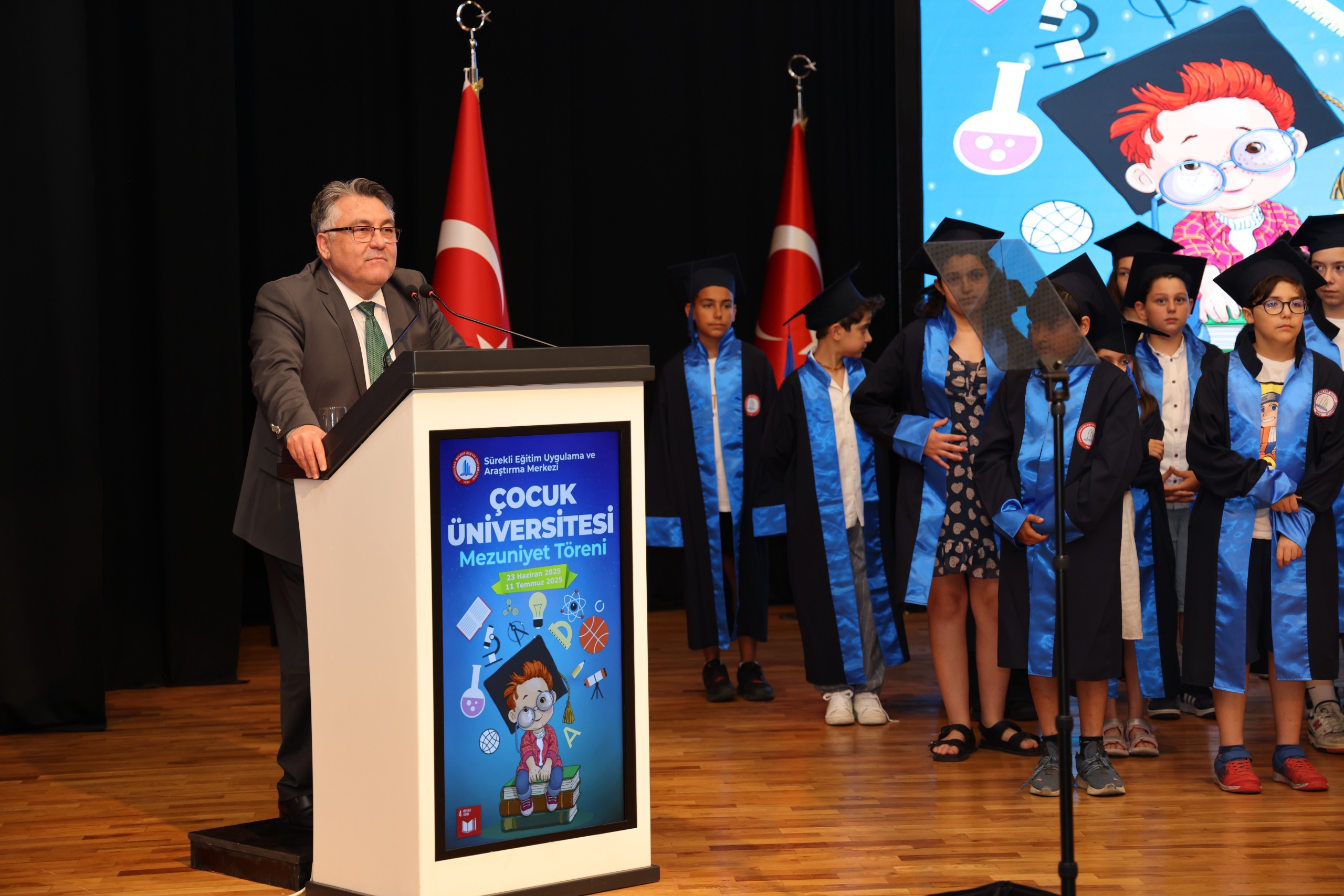 Çocuk Üniversitesi Mezuniyet Töreni'nin açılış konuşmasını gerçekleştirmek üzere kürsüye gelen BEUN Rektörü Prof. Dr. İsmail Hakkı Özölçer, “Çocuklarımıza bilimin, sanatın ve araştırmanın kapılarını araladığımız bu programla onların geleceğe daha donanımlı adımlarla ilerlemesine katkı sunmaktan büyük mutluluk duyuyoruz. Üniversite olarak yalnızca yükseköğretim değil, her yaş grubuna yönelik eğitimi desteklemeye devam edeceğiz.” dedi.