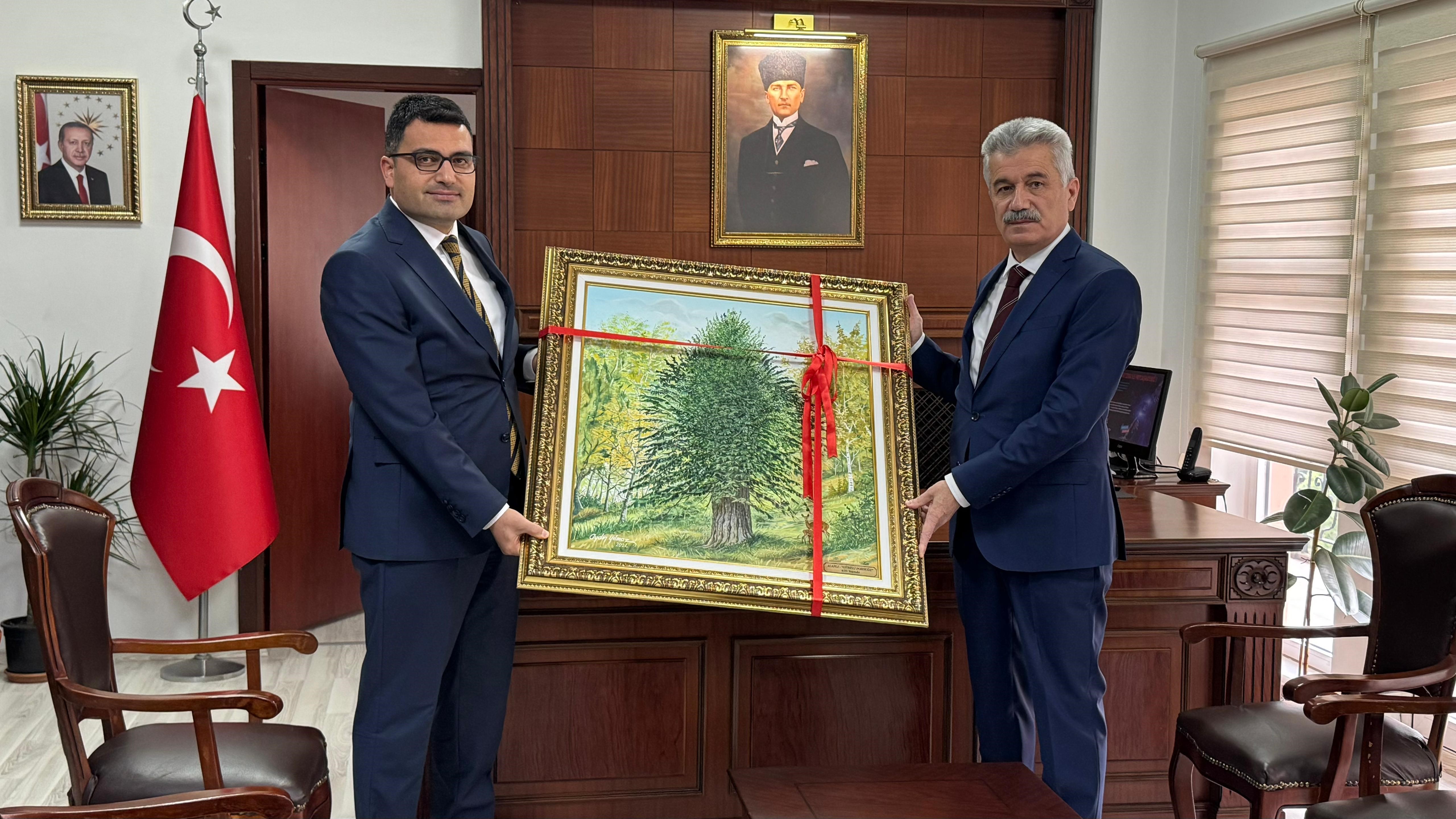 Alaplı Kaymakamı Selçuk Köksal'ın makam odasında gerçekleşen görüşmede, ilçede devam eden yatırım konuları değerlendirildi. Sıcak bir atmosferde gerçekleşen görüşme sonrası Kaymakam Selçuk Köksal, Danıştay Başkanı Zeki Yiğit'i makamında ağırlamaktan onur duyduğunu ifade ederek, bu anlamlı ziyaret için teşekkürlerini iletti. Kaymakam Köksal'ın günün anısına istinaden Danıştay Başkanı Yiğit'e, Gümeli Porsuk Ağacı işlendiği özel yapım bir tablo hediye etti.