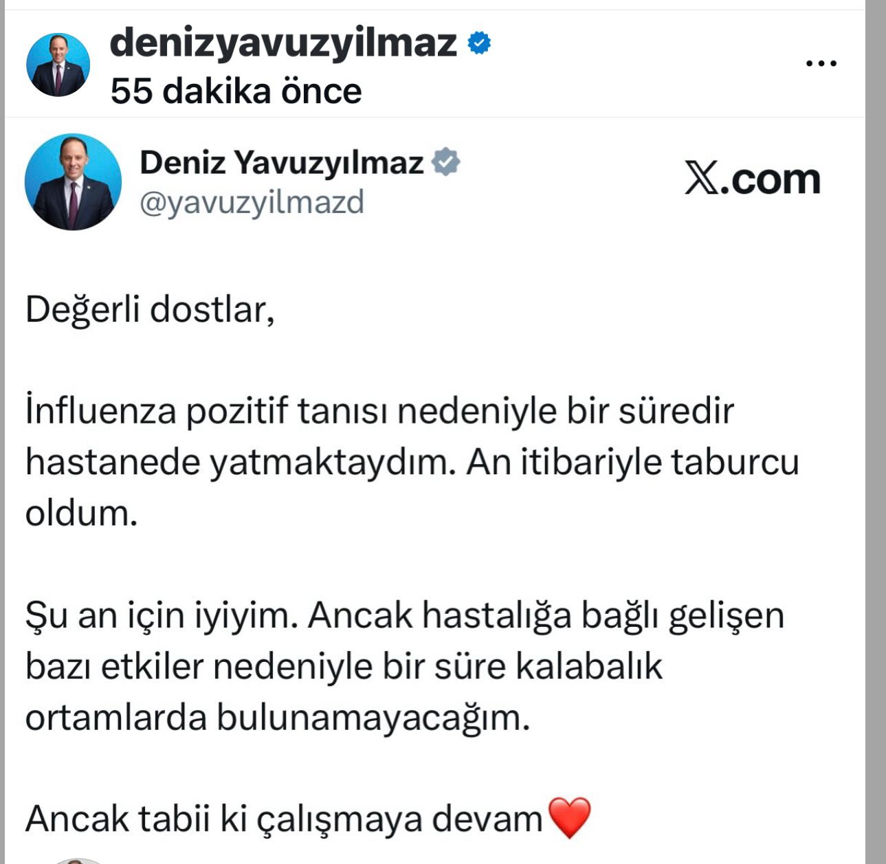 Sağlık durumunun iyi olduğunu belirten Yavuzyılmaz, hastalığa bağlı gelişen bazı etkiler nedeniyle bir süre kalabalık ortamlarda bulunamayacağını ifade ederek, çalışmalarına devam edeceğini dile getirdi.