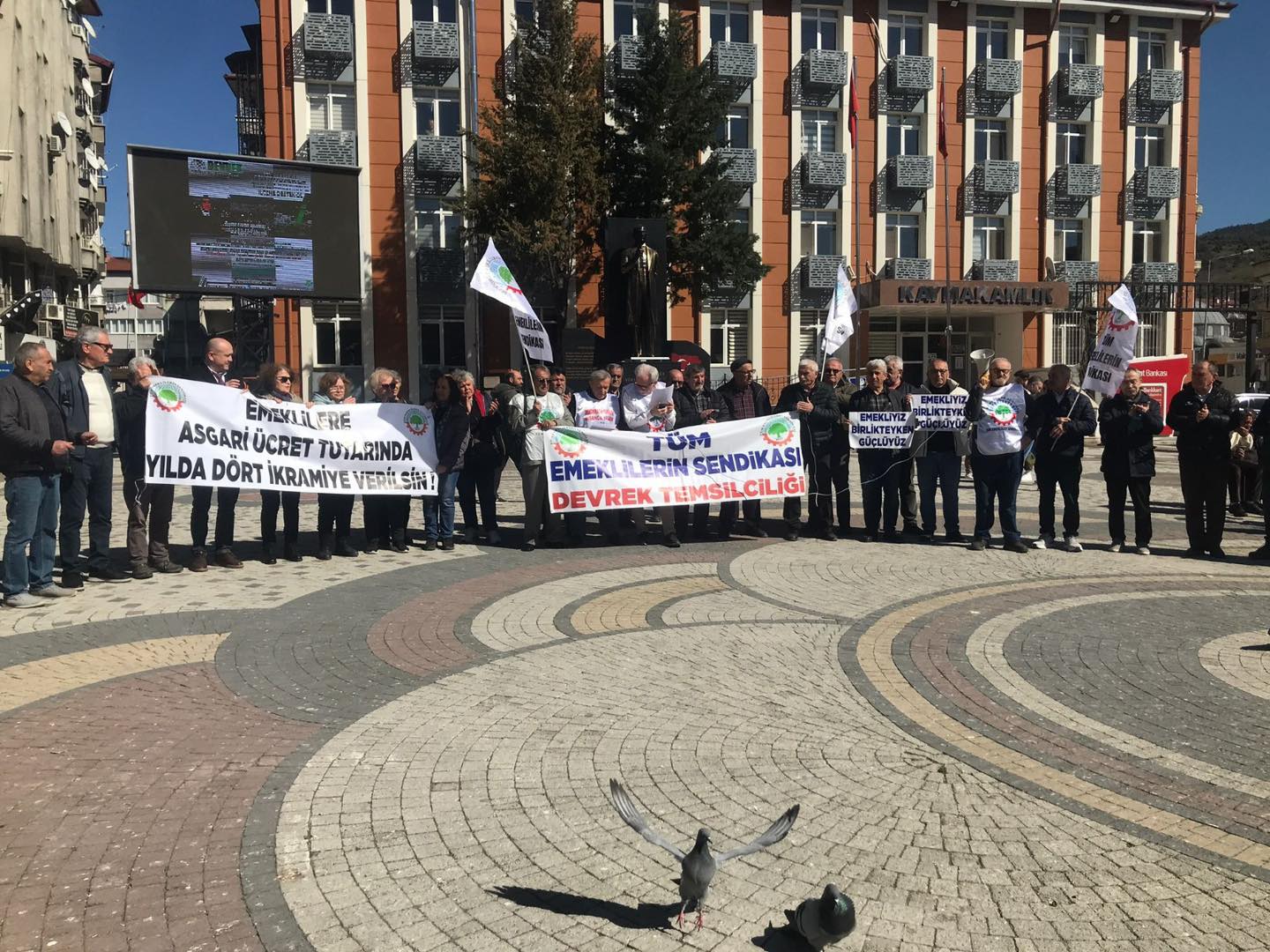 Devrek Cumhuriyet Alanında bir araya gelen sendika üyeleri adına burada konuşan Başkan Yaşan Kantar şunları dile getirdi:“BAHANE ÜSTÜNE BAHANE ÜRETİLİYOR AMA ÇÖZÜM ÜRETİLMİYOR”“AK Parti yine şaşırtmadı. Sıra emeklilere gelince “para yok” denildi. Gabar’da petrol çıkacak denildi, olmadı. Şimdi de savaş gerekçe gösteriliyor. Bahane üstüne bahane üretiliyor ama çözüm üretilmiyor.SGK yönetimi geçen yıl Emekliler için harcamayı planladığı 451 milyar TL’yi harcamadı. 2025 yılı bütçesinde SGK’nin toplam 5,5 trilyon lira harcama yapması planlanırken yıl sonunda gerçekleşen harcama 5 trilyon 54 milyar lira oldu. Yani bütçede öngörülen 451 milyar lira emekliler için kullanılmadı. Bu tablo açıkça emeklinin hakkının gasp edildiğini göstermektedir. Emeklileri açlığa ve yoksulluğa mahkûm edenler bugün hâlâ “kaynak yok” demeye devam etmektedir.TÜİK’in açıkladığı verilere göre Ocak ayında yüzde 4,84, Şubat ayında ise yüzde 2,96 enflasyon gerçekleşti. Bu iki aylık dönemde emeklilerin gelirleri yaklaşık yüzde 8 oranında eridi. Ancak pazarda, markette ve mutfakta hissedilen gerçek enflasyonun açıklanan rakamların çok üzerinde olduğu herkes tarafından bilinmektedir. Emeklilerin alım gücü her geçen gün düşerken hükümet temsilcileri Türkiye’nin “yüksek gelirli ülkeler seviyesine ulaştığını” söylemektedir.”“GERÇEK ORTADADIR: FAİZE VE ŞİRKETLERE KAYNAK VAR, EMEKLİYE YOK”“Eğer Türkiye gerçekten yüksek gelirli bir ülke ise şu soruların yanıtı verilmelidir: Neden milyonlarca emekli açlık ve yoksulluk sınırının altında yaşamaktadır? Neden emeklilere gelince “kaynak yok” denilmektedir?Gerçek ortadadır. Bu ülkede faize milyarlar vardır. Yol, köprü ve şehir hastanelerini işleten şirketlere garanti ödemeleri vardır. Sermayeye verilen teşvikler, vergi afları ve kamu kaynakları vardır. Ancak konu emekliler olduğunda karşımıza sürekli aynı gerekçe çıkarılmaktadır: “Bütçe imkânları sınırlı.”23 yılı aşkın süredir ülkeyi yönetenlerin yanlış ekonomik politikalarının faturası emeklilere kesilemez. Bugün ortaya çıkan tablonun sorumluluğunu emeklilere yüklemek açık bir siyasal ve ekonomik iflastır.”“EMEKLİLER HAKLARINI ALACAK, SANDIKTA GÖRÜŞECEĞİZ”“Bugün milyonlarca emekli için bayram sevinç değil, borç ve geçim sıkıntısı anlamına gelmektedir. Bayram; kredi kartı borçları, ertelenen faturalar ve boş mutfak dolapları demektir. Bayram ikramiyeleri ise artık birkaç günlük mutfak harcamasını bile karşılamayan sembolik ödemelere dönüşmüştür. Bu tablo yalnızca ekonomik değil, aynı zamanda vicdani ve adaletle ilgili bir sorundur.Araştırmalara göre emeklilerin büyük bölümü açlık sınırının yarısından daha düşük aylık almaktadır. Ortalama emekli maaşı asgari ücretin yaklaşık 4 bin lira altındadır. Temel gıda, kira ve enerji giderleri hızla artarken emekli maaşları yıllardır sistemli biçimde erimektedir.Emekliler bu ülkenin yükü değil, yıllarca çalışarak bu ülkenin zenginliğini üreten insanlarıdır. Talep edilen şey yalnızca emeğin ve hakkın karşılığıdır.Tüm Emeklilerin Sendikası olarak taleplerimiz nettir: Bayram ikramiyeleri yılda dört kez ve asgari ücret düzeyinde verilmelidir. En düşük emekli aylığı yeni işe başlayan memur maaşına eşitlenmelidir. Emekli maaşlarında yıllardır biriken kayıplar telafi edilmeli, büyümeden emeklilere pay verilmelidir. Ayrıca emeklilerin sendika hakkının önündeki tüm engeller kaldırılmalıdır.Emekliyi yoksulluğa mahkum eden politikalardan vazgeçilmelidir. Emeklinin yüzü gülmeden bu ülkeye bayram gelmez. Emekliler haklarını alacak; bu kara düzeni ve kötülüğün iktidarını demokratik mücadeleyle değiştirecektir. Sandıkta görüşeceğiz.”Tüm Emeklilerin Sendikası’nın basın açıklamasına, CHP Devrek İlçe Başkanı Uğur Dikenli ve Yönetim Kurulu Üyeleri ve vatandaşlar da destek verdi.Kaynak: Devrekliler