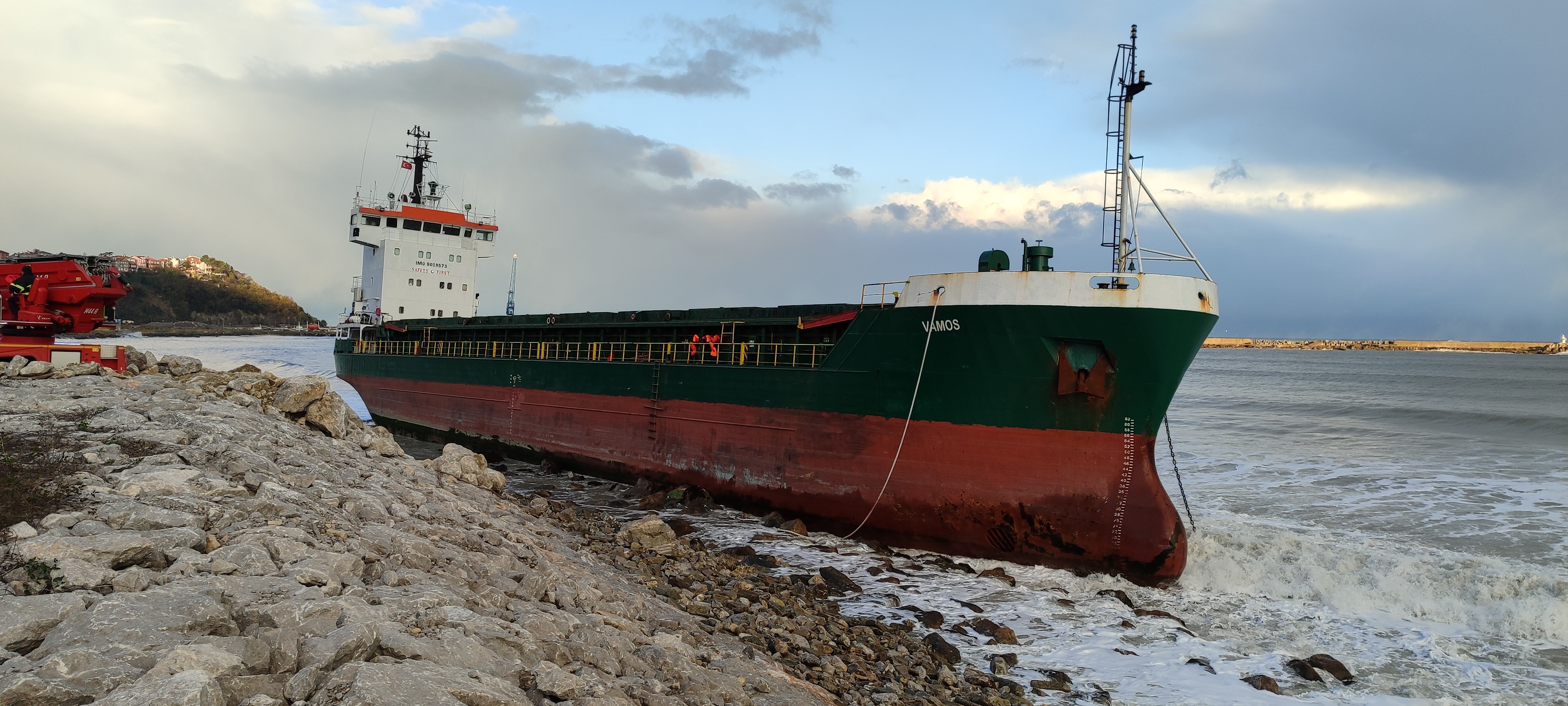 Kastamonu'nun İnebolu ilçesinde iskelede yük boşaltan Kamboçya bandralı 'Vamos' adlı gübre yüklü gemi, şiddetli fırtına sebebiyle halatları kopmasının neticesinde sürüklenerek İnebolu Limanı Filli Köşk mevkiinde karaya oturdu. Gemiden yapılan yardım ihbarları üzerine bölgeye AFAD, sahil güvenlik ve itfaiye ekipleri sevk edildi. Gemide bulunan 2'si Türk 11 kişilik mürettebat, ekipler tarafından tahliye edildi.