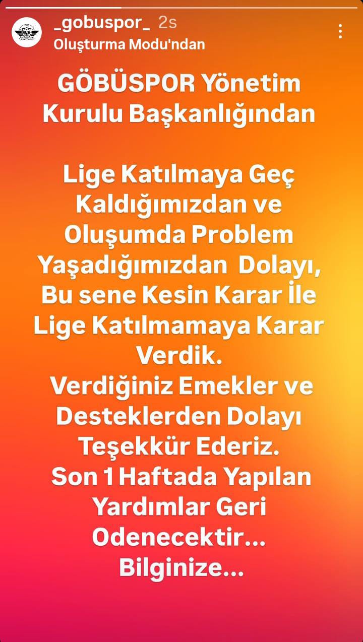 Açıklamada, "Lige katılmaya geç kaldığımızdan ve oluşumda problem yaşadığımızdan dolayı bu sene kesin karar ile lige katılmamaya karar verdik. Verdiğiniz emekler ve desteklerden dolayı teşekkür ederiz. Son 1 haftada yapılan yardımlar geri ödenecektir bilginize" denildi.