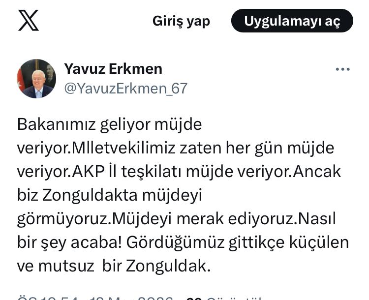 İktidar temsilcisi siyasilerin sürekli müjde adı altında açıklamalar yaptığına dikkat çeken Yavuz Erkmen, paylaşımında şu ifadelere yer verdi: Bakanımız geliyor müjde veriyor.Mlletvekilimiz zaten her gün müjde veriyor.AKP İl teşkilatı müjde veriyor.Ancak biz Zonguldakta müjdeyi görmüyoruz.Müjdeyi merak ediyoruz.Nasıl bir şey acaba! Gördüğümüz gittikçe küçülen ve mutsuz bir Zonguldak.