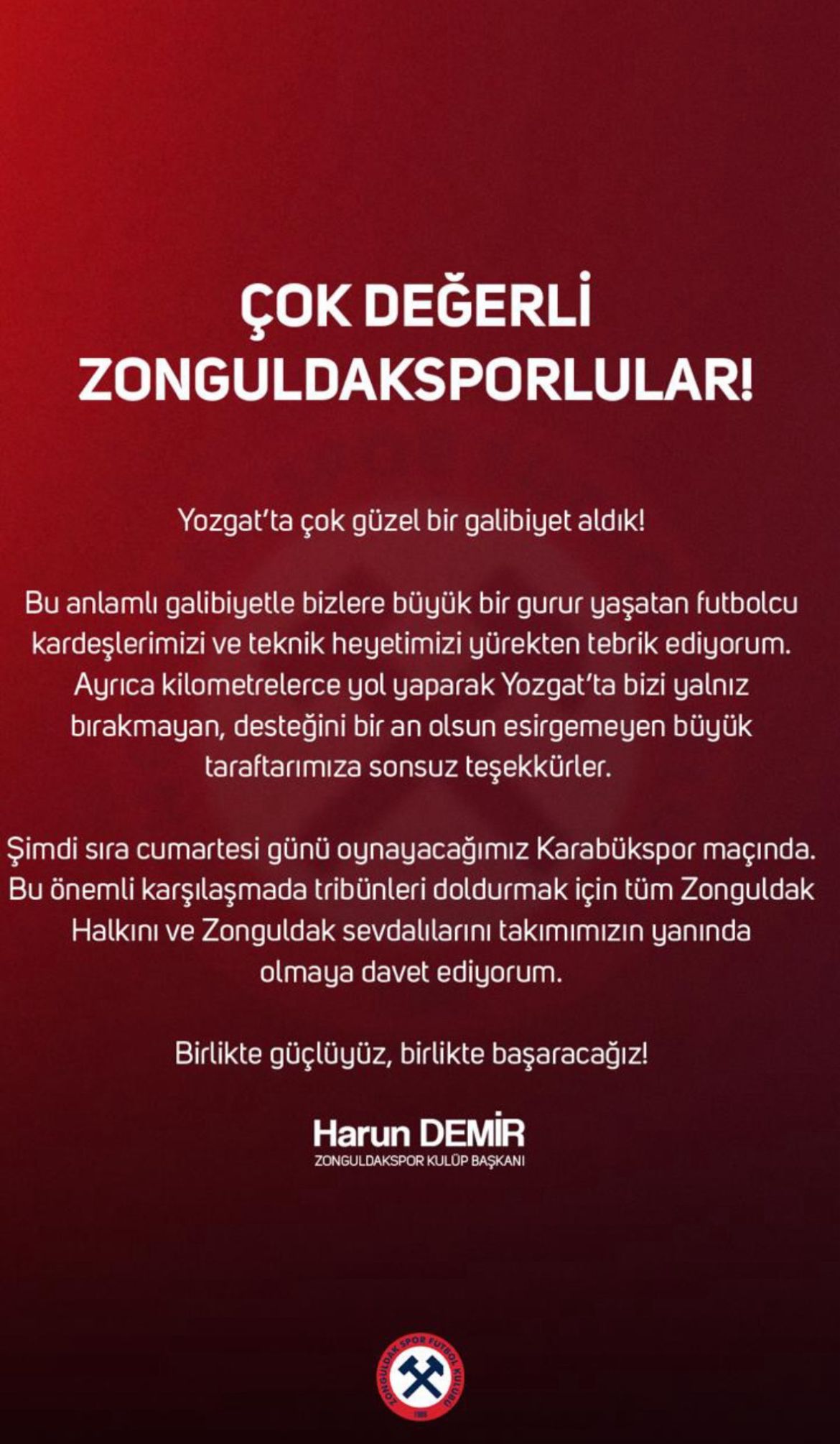 Yozgat’ta çok güzel bir galibiyet aldık!Bu anlamlı galibiyetle bizlere büyük bir gurur yaşatan futbolcu kardeşlerimizi ve teknik heyetimizi yürekten tebrik ediyorum. Ayrıca kilometrelerce yol yaparak Yozgat’ta bizi yalnız bırakmayan, desteğini bir an olsun esirgemeyen büyük taraftarımıza sonsuz teşekkürler.Şimdi sıra cumartesi günü oynayacağımız Karabükspor maçında. Bu önemli karşılaşmada tribünleri doldurmak için tüm Zonguldak Halkını ve Zonguldak sevdalılarını takımımızın yanında olmaya davet ediyorum.Birlikte güçlüyüz, birlikte başaracağız!"