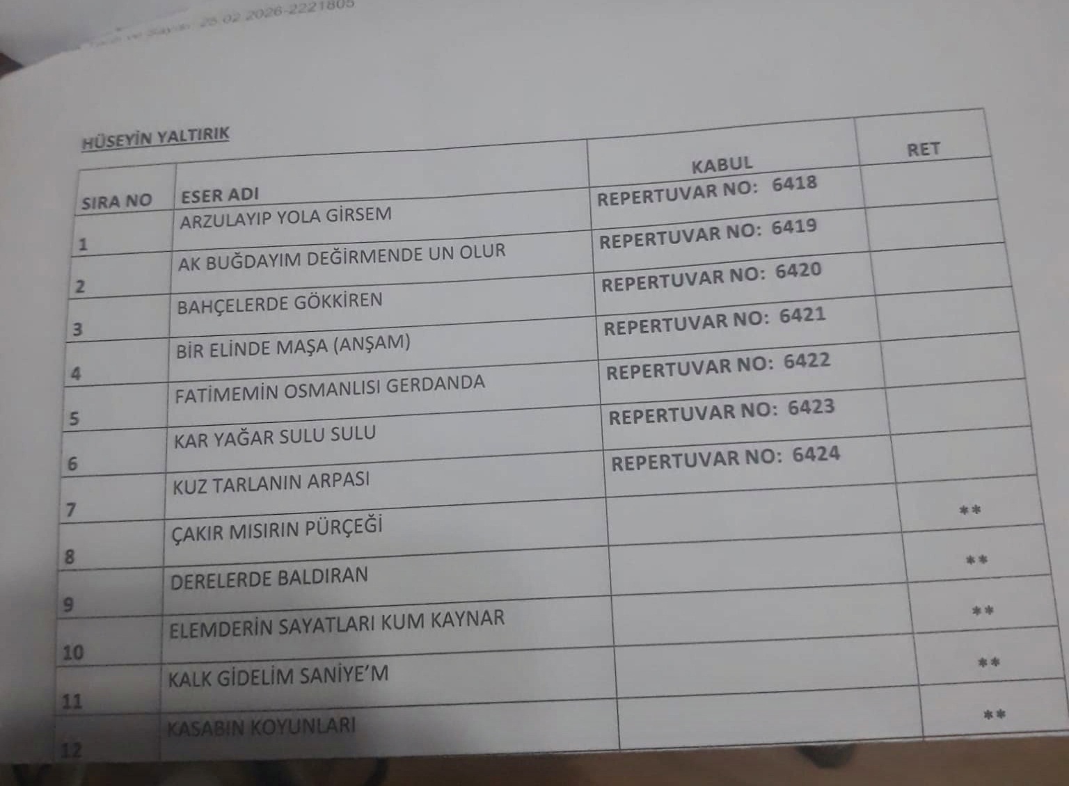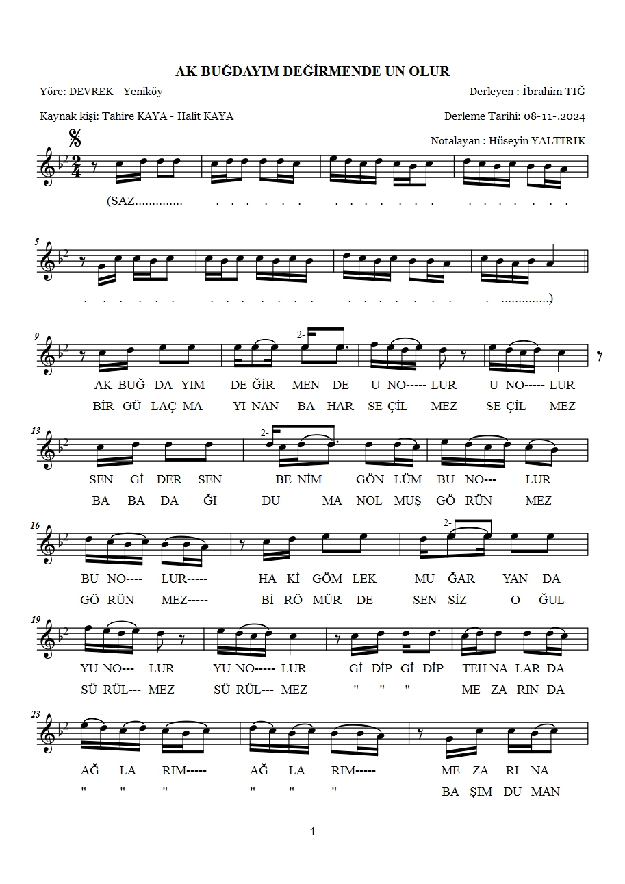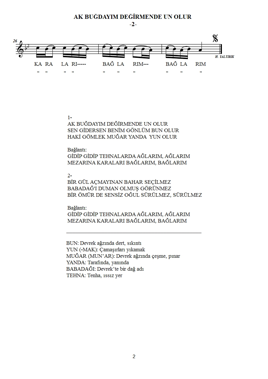 TRT Türk Halk Müziği (THM) Repertuar Kurulu, TRT Müzik Dairesi Başkanı Serkan Özdemir'in başkanlığında 25 Şubat 2026 tarihinde toplanarak, İbrahim Tığ'ın yöremizden derlediği 6 yeni türküyü daha kabul ederek repertuvar arşivine kaydetti. İbrahim Tığ'ın, Tahire-Halit Kaya'dan derlediği "Ak Buğdayım Değirmende Un Olur (Devrek-Yeniköy Köyü, TRT Rep. No: 6419)", Sabahat Öztürk-Nazmiye Tığ'dan derlediği "Bahçelerde Gök Kiren (Karacaören-Bölücek Köyleri, TRT Rep. No: 6420)", Osman Şallı'dan derlediği "Bir Elinde Maşa /Anşam (Yazıcık (Dirgine) Köyü, TRT Rep. No:4621)", Kezban Tığ (Kezbancı) ve Makbule Tığ'dan derlediği "Fatimemin Osmanlısı Gerdanda (Bakırcılar Köyü, TRT Rep. No: 6422)", Tahire-Halit Kaya'dan derlediği "Kar Yağar Sulu Sulu (Devrek-Yeniköy Köyü, TRT Rep. No: 6423)" ve Sabahat Öztürk-Nazmiye Tığ'dan derlediği "Kuz Tarlanın Arpası (Beycuma-Korucuk Köyü, TRT Rep. No: 6424)" adlı 6 Türkü TRT Repertuvar Kurulundan geçti. Türküleri, TRT Türk Halk Müziği Ses Sanatçısı Doç. Dr. Hüseyin Yaltırık notaya aldı. Böylece Zonguldak'ın TRT Türk Halk Müziği Repertuvarında türkü sayısı 22'e yükseldi. İşte Zonguldak'ın TRT Repertuvarında kayıtlı türküleri:1-Kiraz Aldım Dikmeden (Devrek / TRT Rep. No:727)2-Gidiyom Gidemiyom-(Çaycuma / TRT Rep. No:1702),3-Karadır Kaşların Ferman Yazdırır- (Zonguldak / TRT Rep. No:2610),4-Kestaneci Köyünden Abalı da Köyüne- (Ereğli / TRT Rep. No:3679)5-Harman Vakti Kuralım Biz Çekeği- (Ereğli / TRT Rep. No:4341)6-Gelen Atlı Candarma (Oğuzhan Köyü-TRT Rep. No:5588)7-Bir Daracık Pencere (Başlarkadı Köyü-TRT Rep. No: 5581)8-Derelerde Taş mı Olur (Karadere Köyü-TRT Rep. No:5582)9-İstanbul Hocaları- (Bakırcılar Köyü- TRT Rep. No: 5583)10- Bir Evler Yaptırdım (Hışıroğlu Köyü- TRT Rep. No: 5584)11-Yüksek Minareden Attım Ben Bir Taş (Devrek Merkez-TRT Rep. No: 5585)12-Atım Var Ala Bula (Adatepe Köyü- TRT Rep. No:5593)13-Cici Çorabım Cici (Devrek Merkez- TRT Rep. No:5594)14-Zonguldak’ın Treni (Bakırcılar Köyü- TRT Rep. No:5586)15-Hastayım Ata Binemem-Güney Köyü- TRT Rep. No:5596)16-Çam Dibinde Yatan Ayşem (Mekekler Köyü- TRT Rep. No:5595)17-Ak Buğdayım Değirmende Un Olur (Devrek-Yeniköy Köyü, TRT Rep. No: 6419)18-Bahçelerde Gök Kiren (Karacaören-Bölücek Köyleri, TRT Rep. No: 6420)19-Bir Elinde Maşa /Anşam (Yazıcık (Dirgine) Köyü, TRT Rep. No:4621)20-Fatimemin Osmanlısı Gerdanda (Bakırcılar Köyü, TRT Rep. No: 6422)21-Kar Yağar Sulu Sulu (Devrek-Yeniköy Köyü, TRT Rep. No: 6423)22-Kuz Tarlanın Arpası (Beycuma-Korucuk Köyü, TRT Rep. No: 6424) İbrahim Tığ'ın Cide yöresinden derlediği, “Ben Gidiyorum Buradan” adlı türkü TRT Repertuvar Kurulu üyelerince kabul edilerek 6126 repertuvar numarasıyla kayıt altına alınmıştı.
