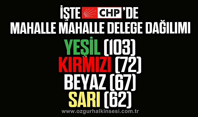 Buna göre 4 mahallede kazanan yeşil liste 103 delege, 6 mahallede kazanan kırmızı liste 72 delege, altı mahallede kazanan beyaz iste 67 delege, 3 mahallede bağımsız giren sarı liste 62 delege kazandı. Tepebaşı Mahallesinde beyaz liste bağımsız listeyle birlikte hareket etti. Bugün yapılan ve 61 delege ile en fazla dileye sahip olan Bahçelievler Mahallesi’nde yeşil iste, ikinci en büyük delege sayısına sahip olan Tepebaşı’nda sarı liste galip gelince kırmızı listenin başını çektiği Ebru Uzun yeniden merkez ilçe başkan adayı olma şansını zora soktu. Ebru Uzun en büyük handikapı ise Harun Akın ile birlikte hareket etmesi oldu. İşte renklere göre mahalle mahalle delege dağılımı .YEŞİL LİSTE: (103 delege)