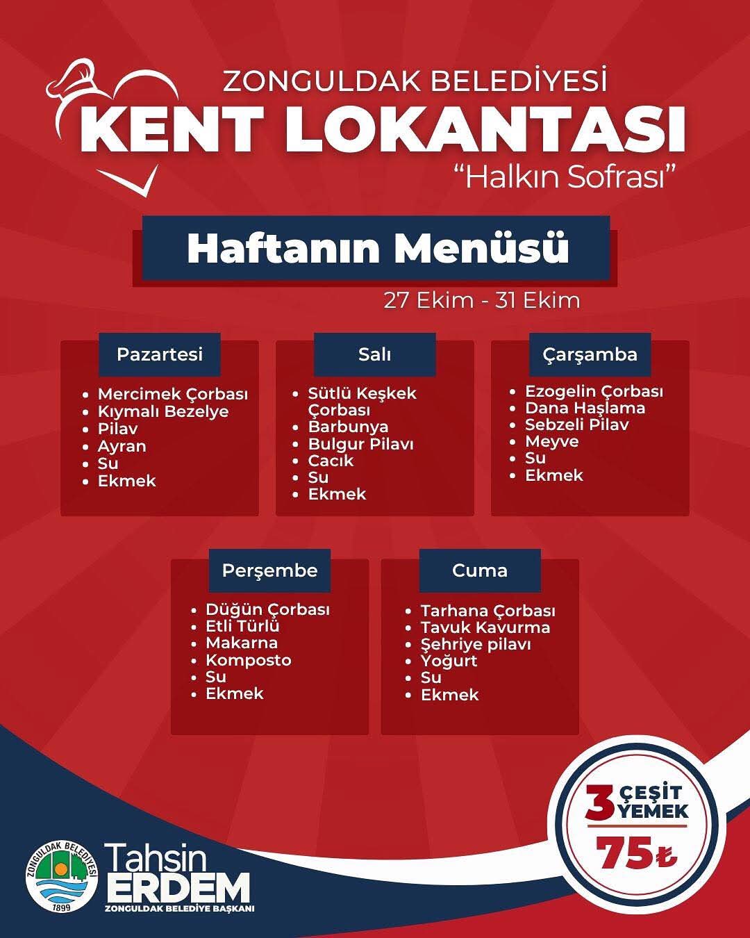 Üç çeşit yemeği 75 liradan satışa sunarak dar gelirli vatandaşların gıdaya erişebilmesini sağlayan Zonguldak Belediyesi Kent Lokantası'nda bugünün menüsünde; mercimek çorbası, kıymalı bezelye, pilav, ayran, su ve ekmek yer alıyor.İşte Belediye Kent Lokantası'nda haftanın menüsü: