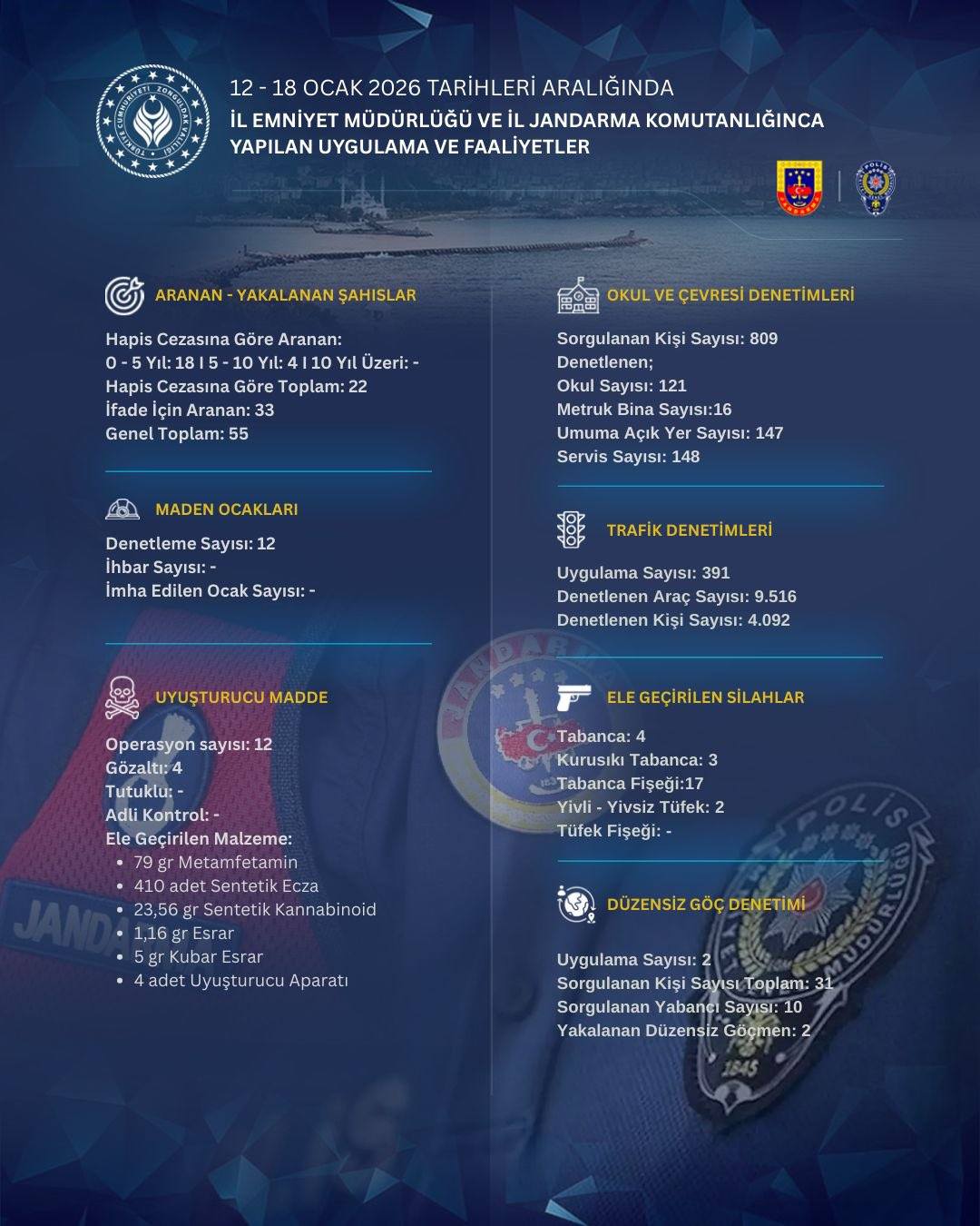 Zonguldak’ta İl Emniyet Müdürlüğü ve İl Jandarma Komutanlığı ekiplerince 12–18 Ocak 2026 tarihleri arasında gerçekleştirilen uygulama ve denetimlerin bilançosu Zonguldak Valiliği tarafından kamuoyuyla paylaşıldı.