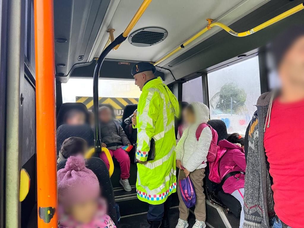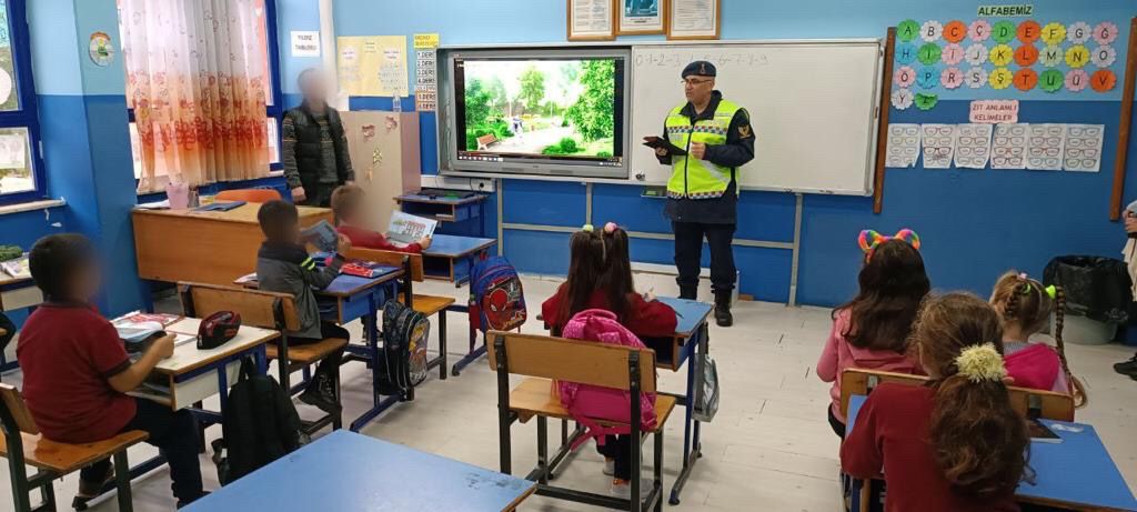 Okul servis araçlarının kontrolüne müteakip öğrencilere “Trafik Kuralları” hakkında bilgilendirmeler yapılarak çocuklarda farkındalık oluşturmak amacıyla trafik boyama kitabı dağıtıldı.