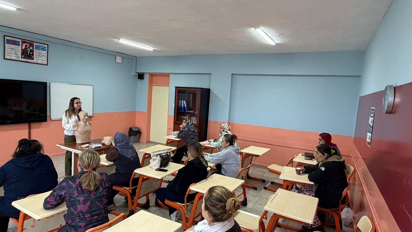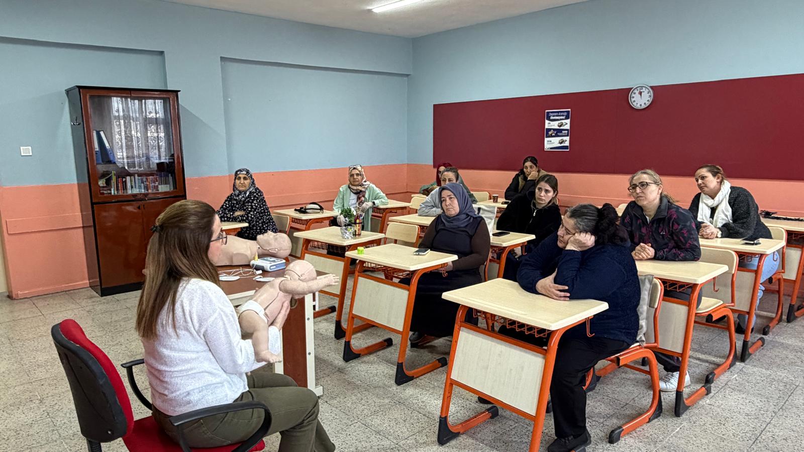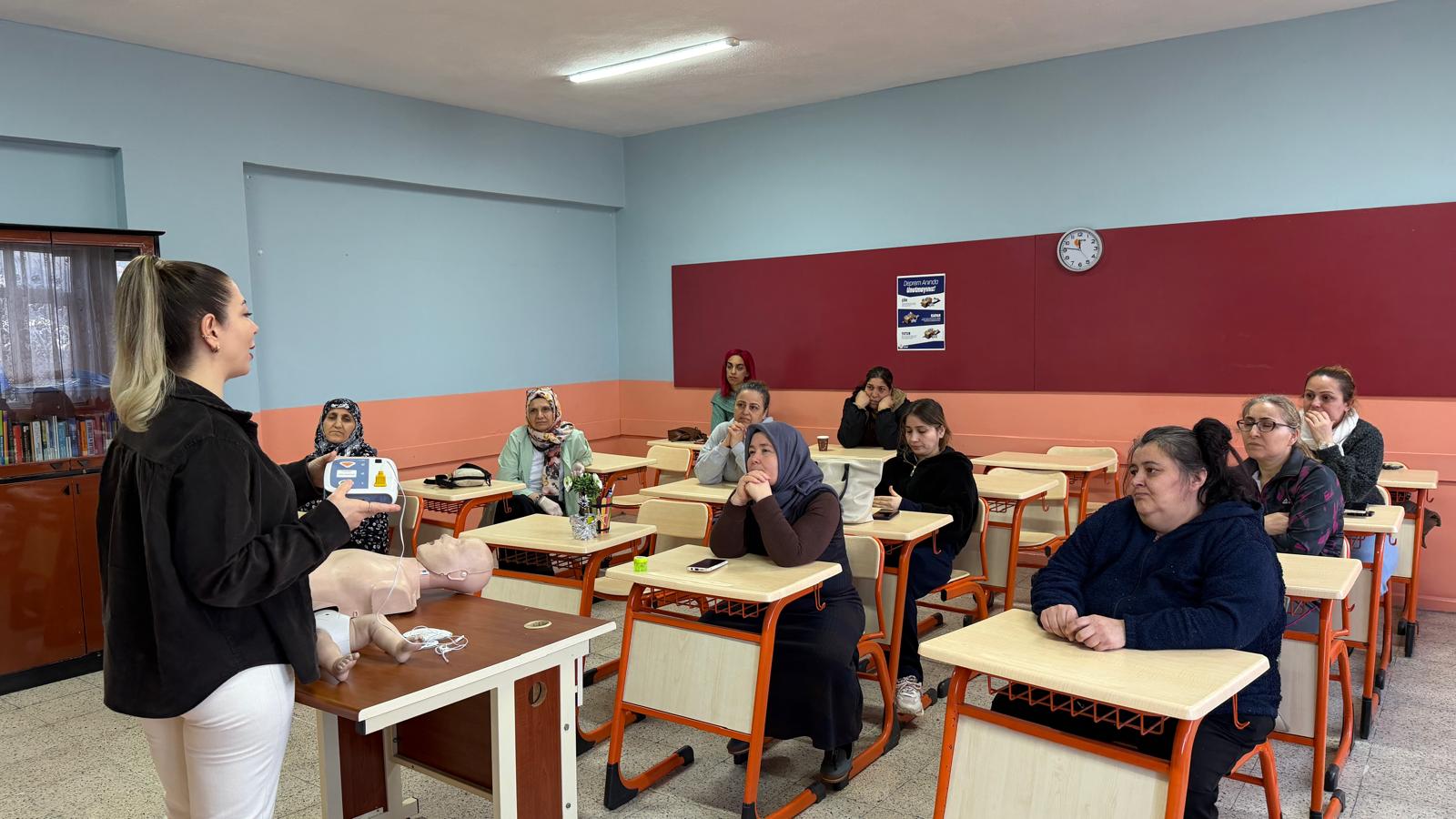 Acil ve Afetlerde Sağlık Hizmetleri Biriminde görevli İlkyardım Eğitimcileri Merve Ocaklı ve Özlem Yıldız tarafından kadınlara yönelik verilen eğitimde katılımcılara Temel Yaşam Desteği, Otomatik Eksternal Defibrilatöz (OED ) Cihaz tanıtım ve kullanımı, Yetişkin ve çocuk Hava Yolları Tıkanıklıkları, Kanamalar, Yaralanmalar ve Zehirlenmelerle ilgili olarak geniş kapsamlı olarak teorik ve uygulamalı olarak eğitimler verildi.