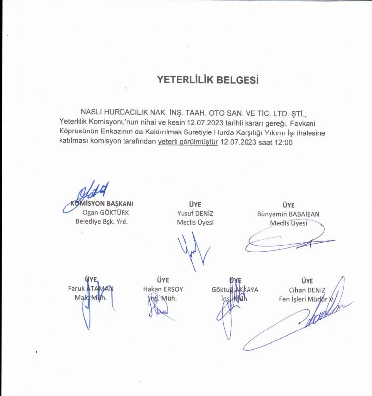 Özgür Halkı Sesi’nin ele geçirdiği ve Naslı Hurdacılık’ın Fevkani köprü ihalesine girmek için evraklarının tam olduğunu gösteren belgede 7 kişinin imzası bulunuyor. Zonguldak Belediye Başkan Yardımcısı Ogan Göktürk’ün başkanlığında toplanan ihale komisyonunda olan belediye meclis üyeleri Yusuf Deniz ve Bünyamin Babaiban, Makine Mühendisi Faruk Ataman, İnşaat Mühendisleri Hakan Ersoy ve Göktuğ Akkaya ile Fen İşleri Müdürü Cihan Deniz bahsi geçen belgeye imza atıyor.