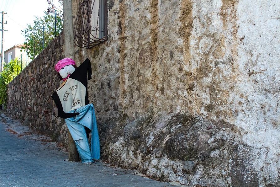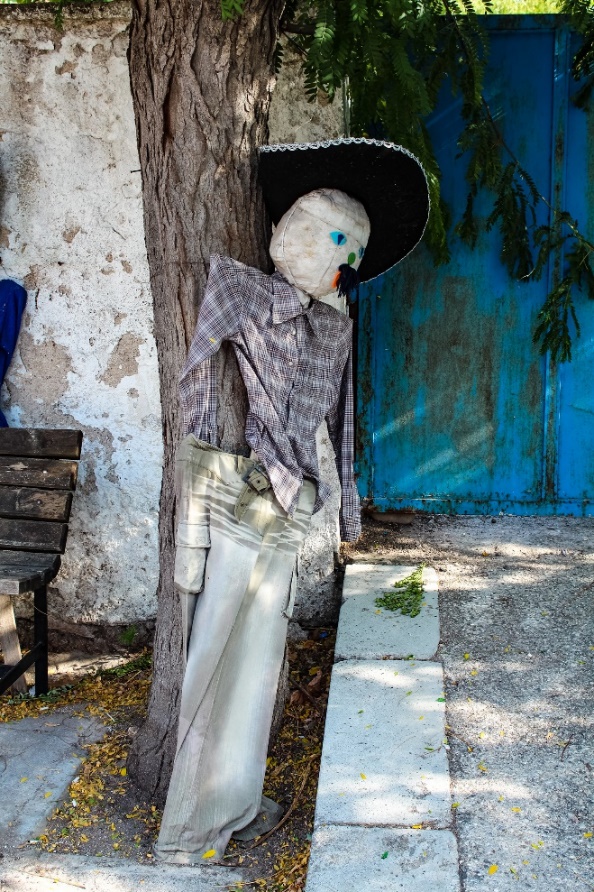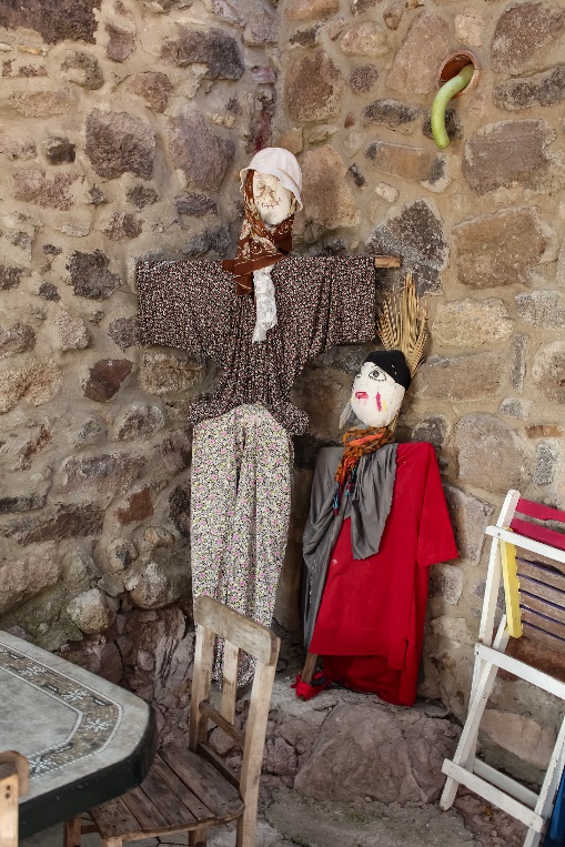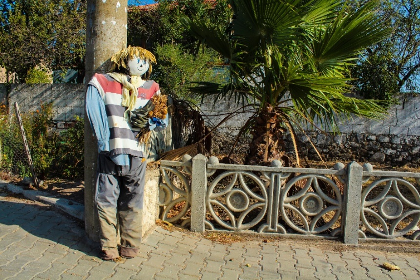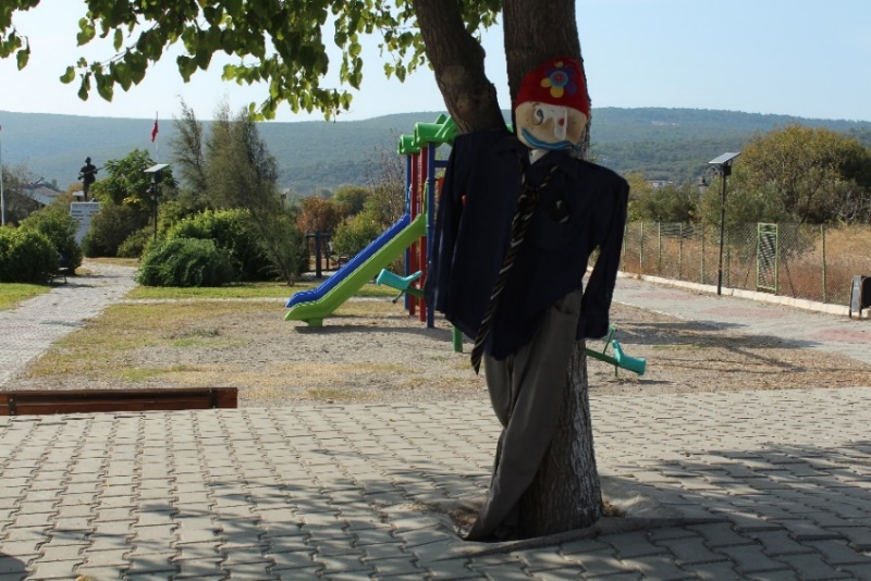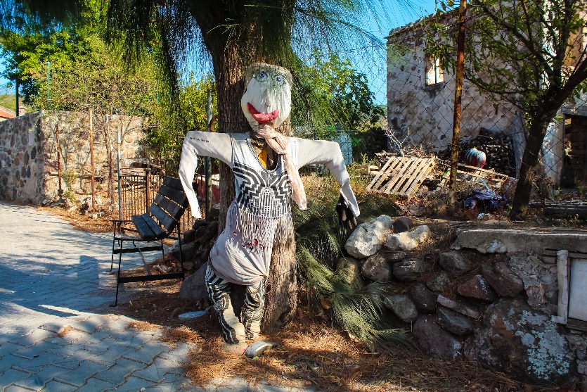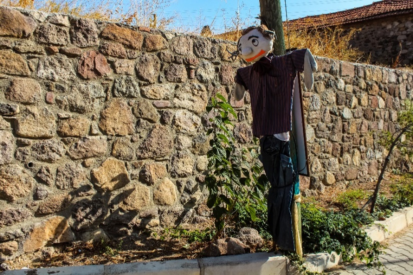Köy meydanında birçok korkuluk fotoğraf çektirmeye davet ediyor ve bir tanesi ağaçtan seyrediyor sizi.