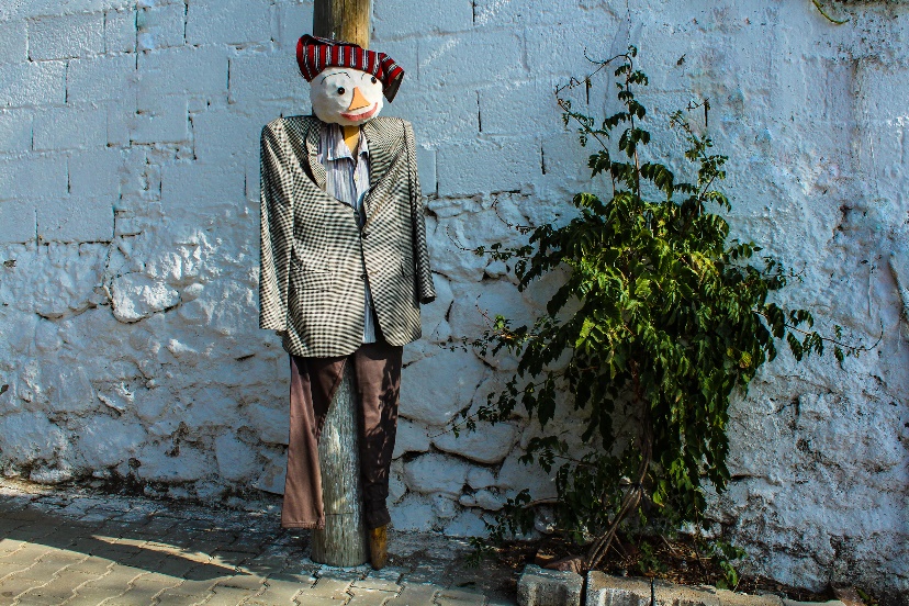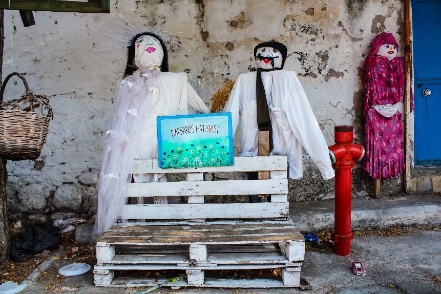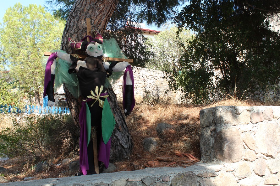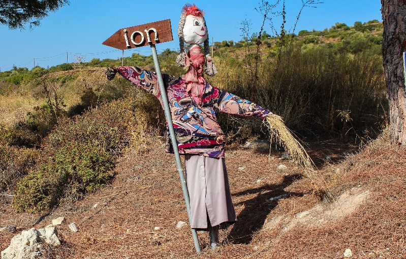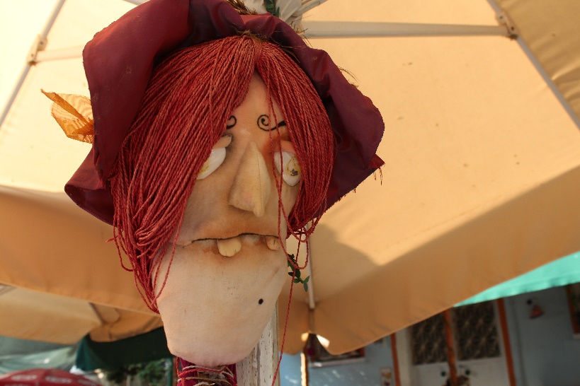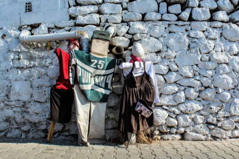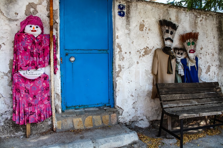 Köy meydanında birçok korkuluk fotoğraf çektirmeye davet ediyor ve bir tanesi ağaçtan seyrediyor sizi.