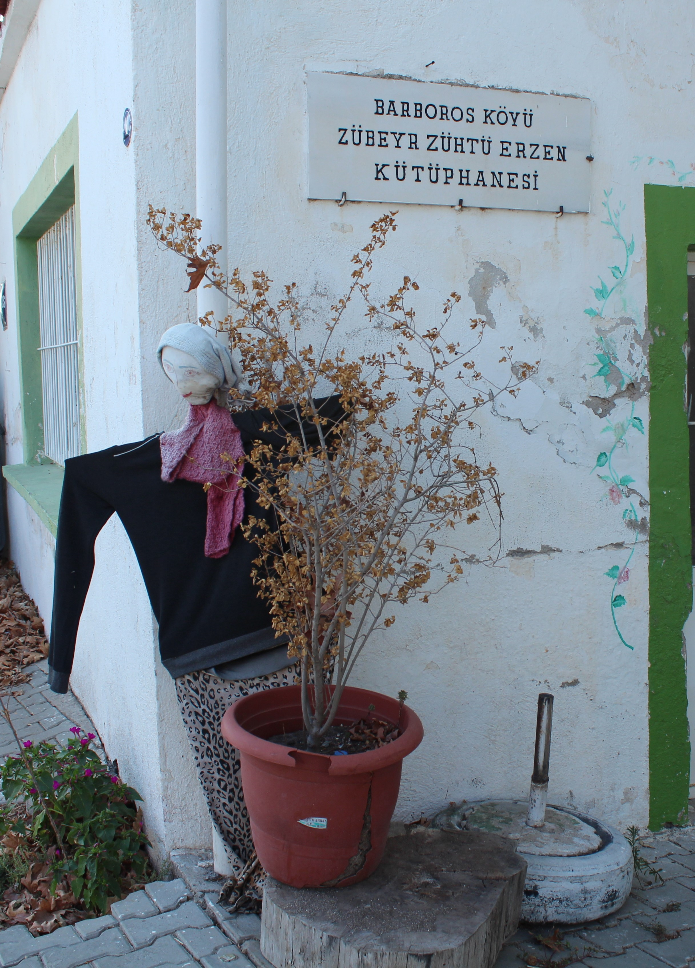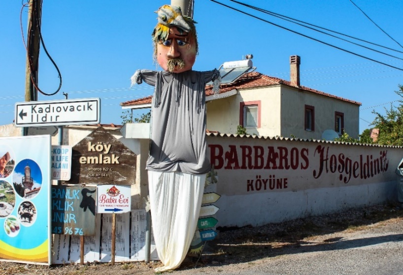 Barbaros Köyü Urla ilçesine bağlı renkli bir hayata sahip çoğunlukla Türkmen yörüklerinin yaşadığı güzel bir mahalle. Bu renklilik mahallenin her bir köşesinde bulunan çeşit çeşit korkulukların renkli dünyası ile bütünleşmiş. Girişte de sizi ion tabelasıyla karşılayan güler yüzlü bayan korkuluk renklendiriyor dünyanızı ilk. İletişime geçiyorsunuz sanki.