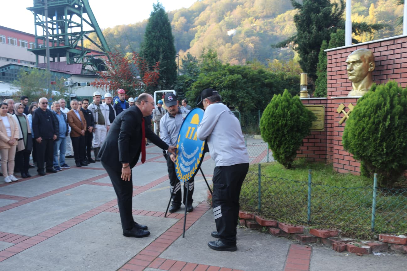 Haber: Cevat Baran ÇAYDAŞ TTK Üzülmez Müessese Müdürlüğü'nde düzenlenen törende, Atatürk Anıtı'na çelenk sunuldu.Yer altında çalışan maden işçileri, saatler 09.05'i gösterdiğinde işi bırakıp Atatürk'ü anmak için Türk Bayrağı'nın önünde saygı duruşuna geçti. Baretleriyle Türk bayrağı önünde saygı duruşuna geçen işçiler, sirenler eşliğinde 2 dakika boyunca esas duruşta bulundu.