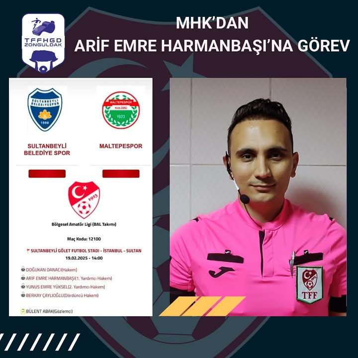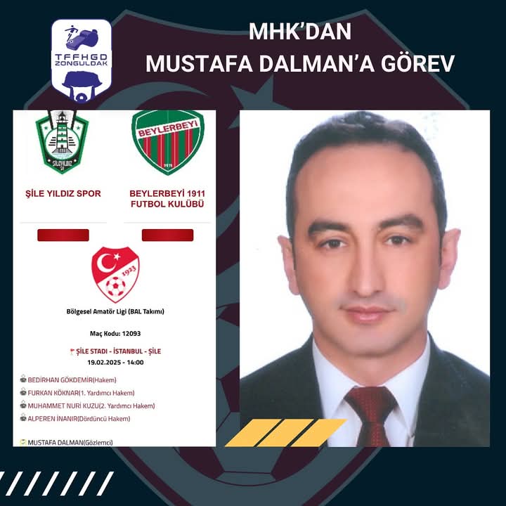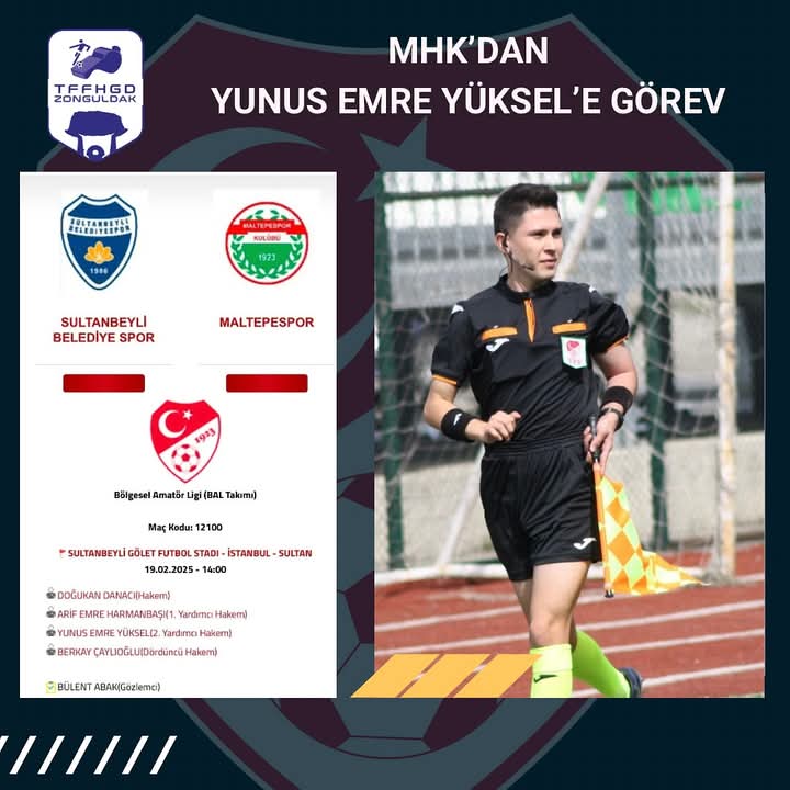 DALMAN'A GÖREV MHK, Şile Yıldızspor ile Beylerbeyi 1911 Futbol Kulübü arasında bugün saat 14.00'te Şile Stadı'nda oynanacak olan Bölgesel Amatör Lig müsabakası için Zonguldak'tan Bölgesel Gözlemci Mustafa Dalman görevlendirildi. Bugün saat 14.00'te Sultanbeyli Gölet Futbol Stadı'nda oynanacak olan Sultanbeyli Belediyespor - Maltepespor Bölgesel Amatör Lig müsabakasında düdük çalacak hakemi belirledi. Zonguldaklı Bölgesel Hakem Doğukan Danacı, bu karşılaşmada görev yapacak.TRİODA İKİ ZONGULDAKLIÖte yandan bugün saat 14.00'te Sultanbeyli Gölet Futbol Stadı'nda oynanacak olan Sultanbeyli Belediyespor - Maltepespor Bölgesel Amatör Lig müsabakasında ise yardımcı hakem olarak Zonguldaklı Bölgesel Yardımcı Hakemler Arif Emre Harmanbaşı ve Yunus Emre Yüksel görev alacak.