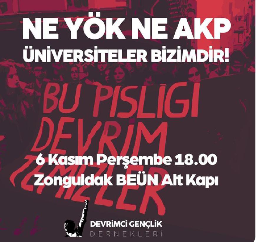 Devrimci Gençlik Dernekleri, tüm öğrencileri AKP iktidarının güdümündeki Yükseköğretim Kurulu'nun (YÖK) eğitim politikalarına karşı tepki göstermek için Bülent Ecevit Üniversitesi alt kapıda toplanmaya çağırdı."Ne YÖK ne AKP Üniversiteler Bizimdir" çağrısıyla yapılan protesto gösterisinin 6 Kasım Perşembe günü saat 18.00'de yapılacağı bildirildi.