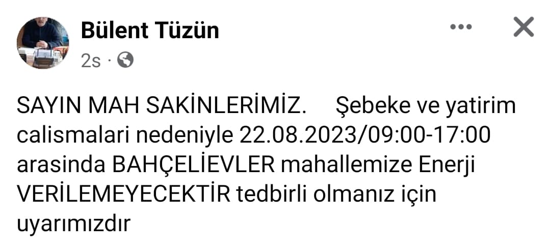 Bahçelievler Mahallesi Muhtarı Bülent Tüzün, konuyla ilgili olarak sosyal medya üzerinden yaptığı açıklamada 22 Ağustos 2023 tarihinde sabah saat 09.00’da 17.00’ye kadar şebeke bakım ve yatırım nedeniyle elektrik kesintisine gidileceğini belirterek mahalle sakinlerinin tedbirli olmasını istedi.