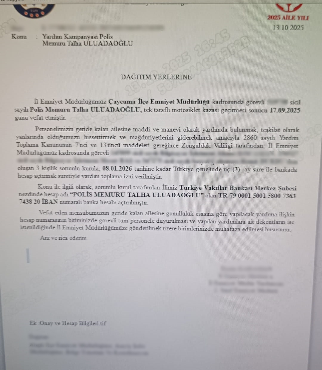 Genç polis memurunun ani vefatı, meslektaşlarını ve sevenlerini yasa boğarken, geride kalan ailesine maddi ve manevi destek olabilmek amacıyla gönüllülük esasına dayanan bir bağış kampanyası organize edildi.