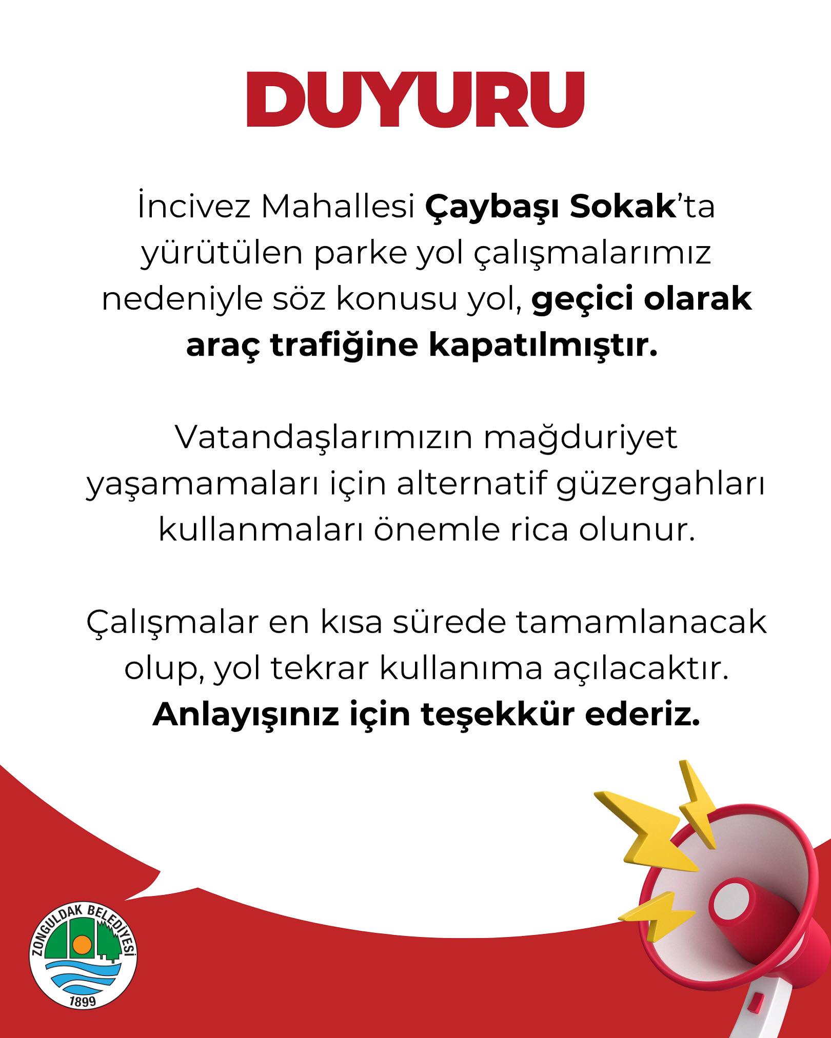 Zonguldak Belediyesi, çalışmalar tamamlanana kadar sürücülere uyarılara dikkat etmeleri çağrısında bulundu.