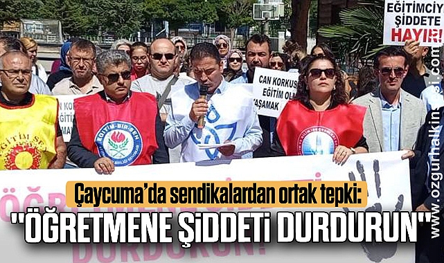 Hürriyetçi Eğitim Sen, Eğitim Sen, Eğitim-İş, Eğitim-Bir-Sen ve Türk Eğitim-Sen Çaycuma Temsilcilikleri tarafından yapılan basın açıklamasında, "Üzülerek belirtmek isteriz ki eğitim öğretim yılının başladığı bu günlerde Çaycuma’da da öğretmenlerimize yönelik şiddet olayları ve öğretmenlerimizin moral ve motivasyonu düşüren durumlar yaşanmaktadır." denildi. "Öğretmeni koruyan kanun istiyoruz!, Öğretmene şiddeti durdurun!, Öğretmene şiddete hayır!" sloganların atıldığı basın açıklamasında sendikalar adına ortak basın metnini okuyan Hürriyetçi Eğitim Sen Çaycuma Temsilcisi Bülent Özcan şunları söyledi: "Bugün burada, okullarımızın en temel görevi olan eğitim-öğretim ortamını zehirleyen bir kangrenle yüzleşmek için toplandık: Öğretmene yönelik şiddet ve okullardaki güvenlik sorunları.
