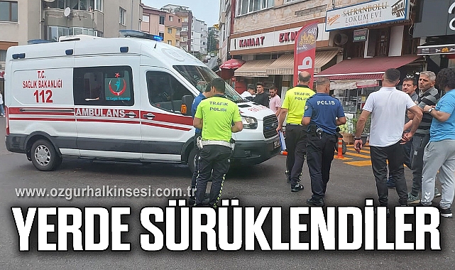 Zonguldak'ın Ereğli ilçesinde otomobile çarpmamak için fren yapan motosiklet sürücüsü, arkasındaki yolcusu ile birlikte yerde sürüklendi.