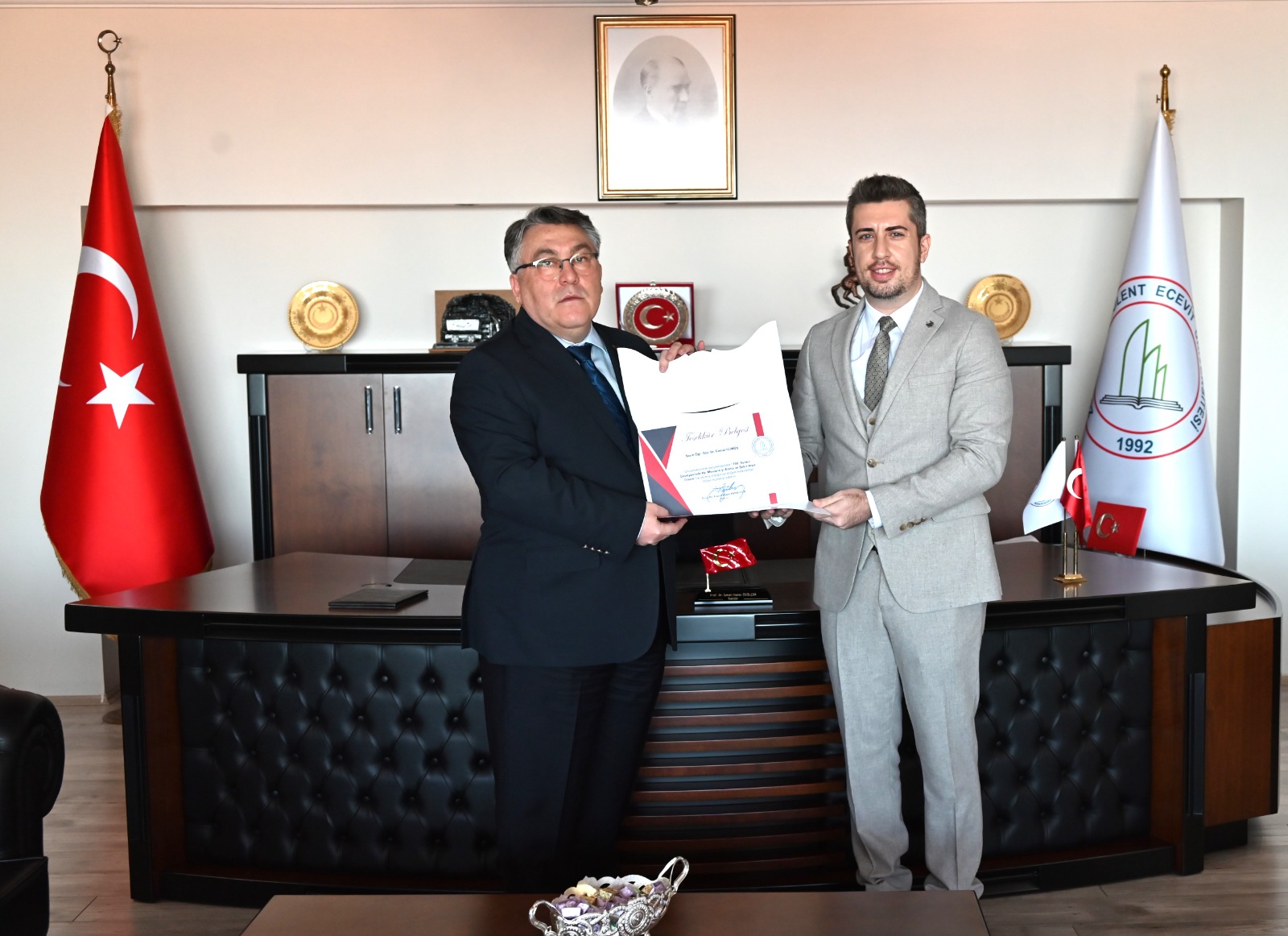 Ziyaretten duyduğu memnuniyeti dile getiren Rektör Özölçer, 14 Aralık 2023 tarihinde Üniversitede düzenlenen ‘750. Sene-i Devriyesinde Hz. Mevlana’yı Anma ve Şeb-i Arus Töreni’nin gerçekleştirilmesine sundukları katıdan dolayı Gümüş ve Yıldırım’a teşekkür belgesi takdim etti.