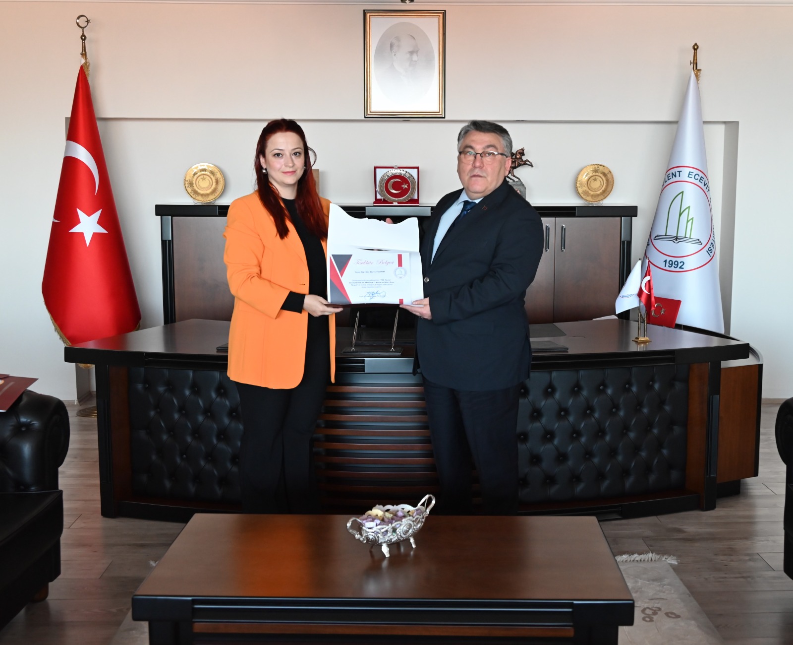 Zonguldak Bülent Ecevit Üniversitesi Rektörü Prof. Dr. İsmail Hakkı Özölçer, Devrek MYO Büro Hizmetleri ve Sekreterlik Bölümü Öğretim elemanı Dr. Öğr. Gör. Cemal Gümüş ve El Sanatları Bölümü öğretim elemanı Öğr. Gör. Merve Yıldırım’ ı makamında ağırladı.