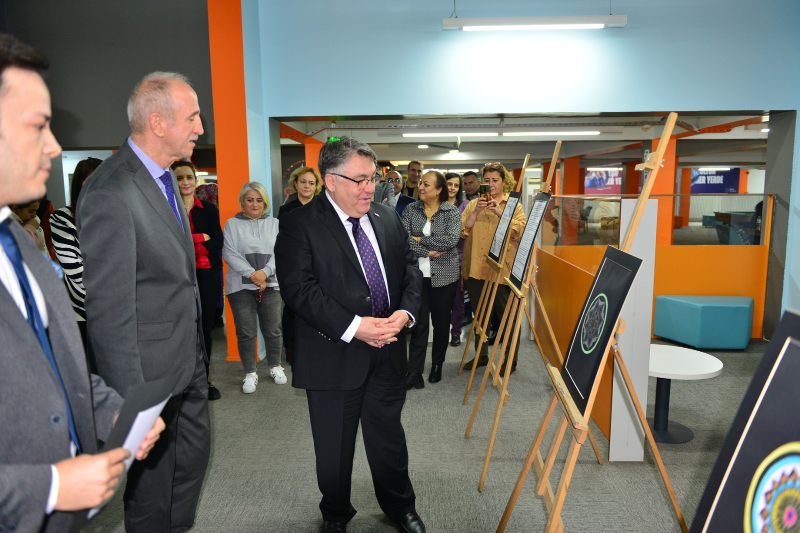 Öğr. Gör. Dr. Musa Özsavran’ın ‘Mandala sanat terapisinin özel gereksinimi olan çocukların annelerinin konfor düzeyine etkisi: Randomize kontrollü çalışma’ başlıklı doktora tezinden ele edilen eserlerden oluşan sergiyi gezen Rektör Özölçer, sanatın iyileştirici gücünün önemine değinerek Engelliler Haftasında böylesi anlamlı bir sergi düzenledikleri için öğretim elemanlarını tebrik etti.