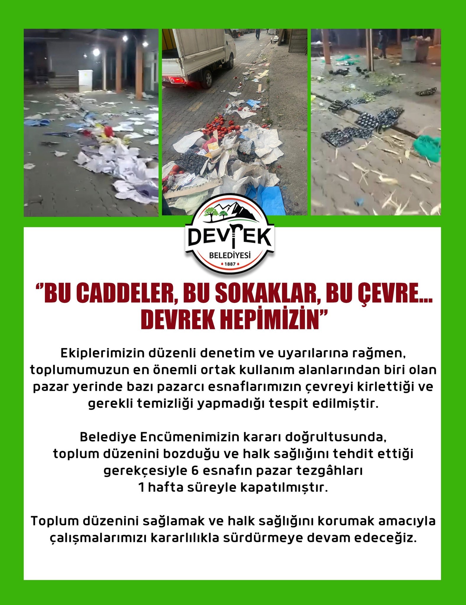 Devrek Belediyesi tarafından yapılan açıklamada, esnafların tüm uyarılara rağmen çevre kirliliğine sebep oldukları gerekçesiyle tezgâhlarının 1 hafta süreyle kapatıldığı duyuruldu.