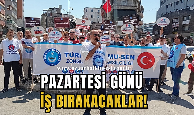 * Pazartesi: Ülke genelinde 1 günlük iş bırakma eylemi gerçekleştirilecek.""ALIN TERİMİZİ İSTİYORUZ"Ören, ayrıca bu eylemler kapsamında Ankara'da Hazine ve Maliye Bakanlığı, illerde ise kurum önlerinde protestolar düzenleyeceklerini bildirdi. Tüm vatandaşları mücadelelerine destek olmaya davet eden Türkiye Kamu-Sen Zonguldak İl Temsilcisi Şahin Ören, "Hakkımız olmayanı değil alın terimizin karşılığını istiyoruz" diyerek sözlerini tamamladı.